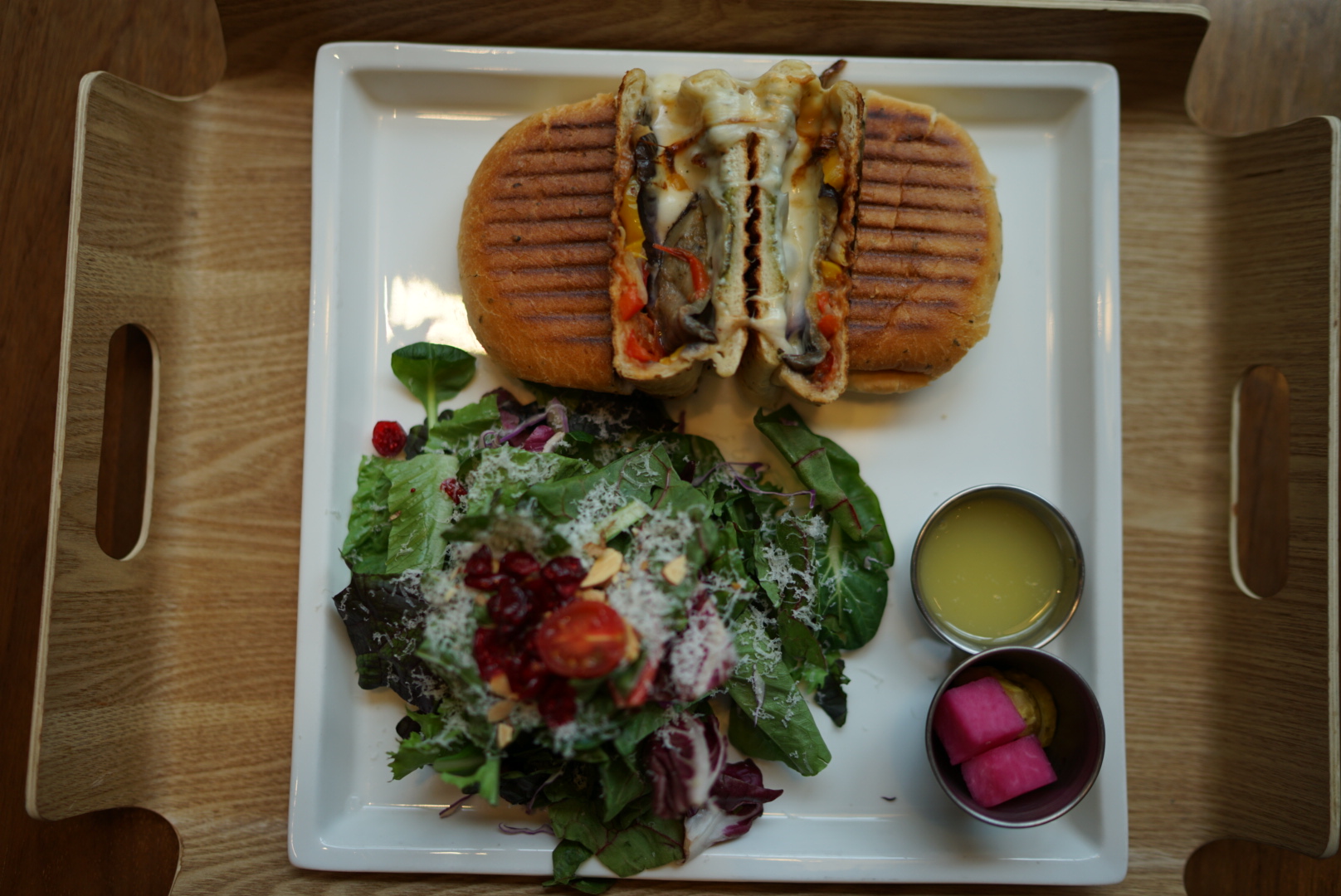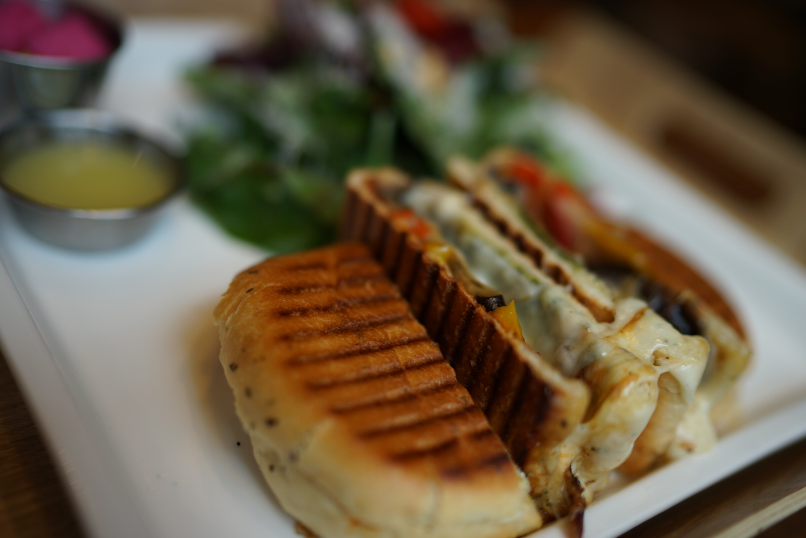파니니를 잘 구워서 네조각으로 썰고