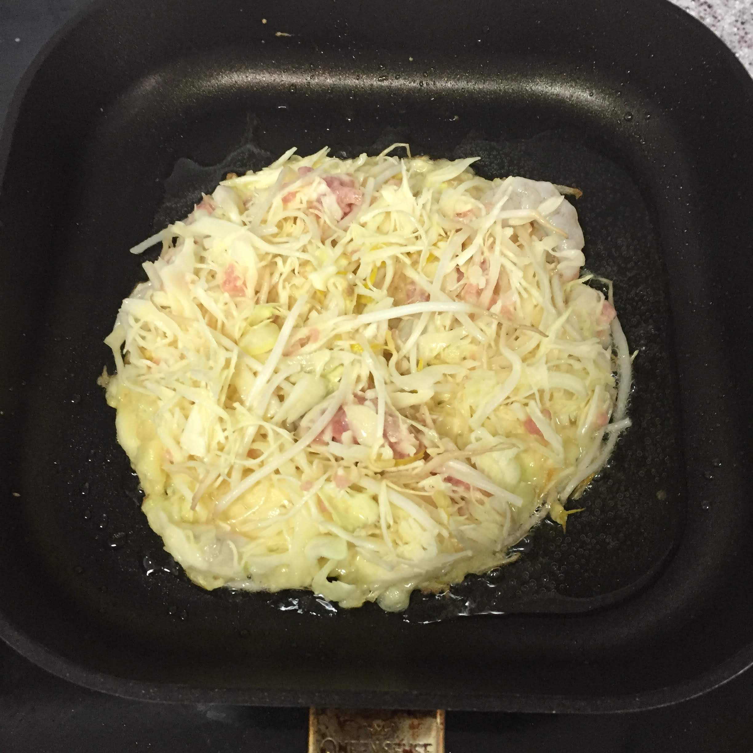 오코노미야키의 한쪽면이 어느정도 다 익었다 싶으면
