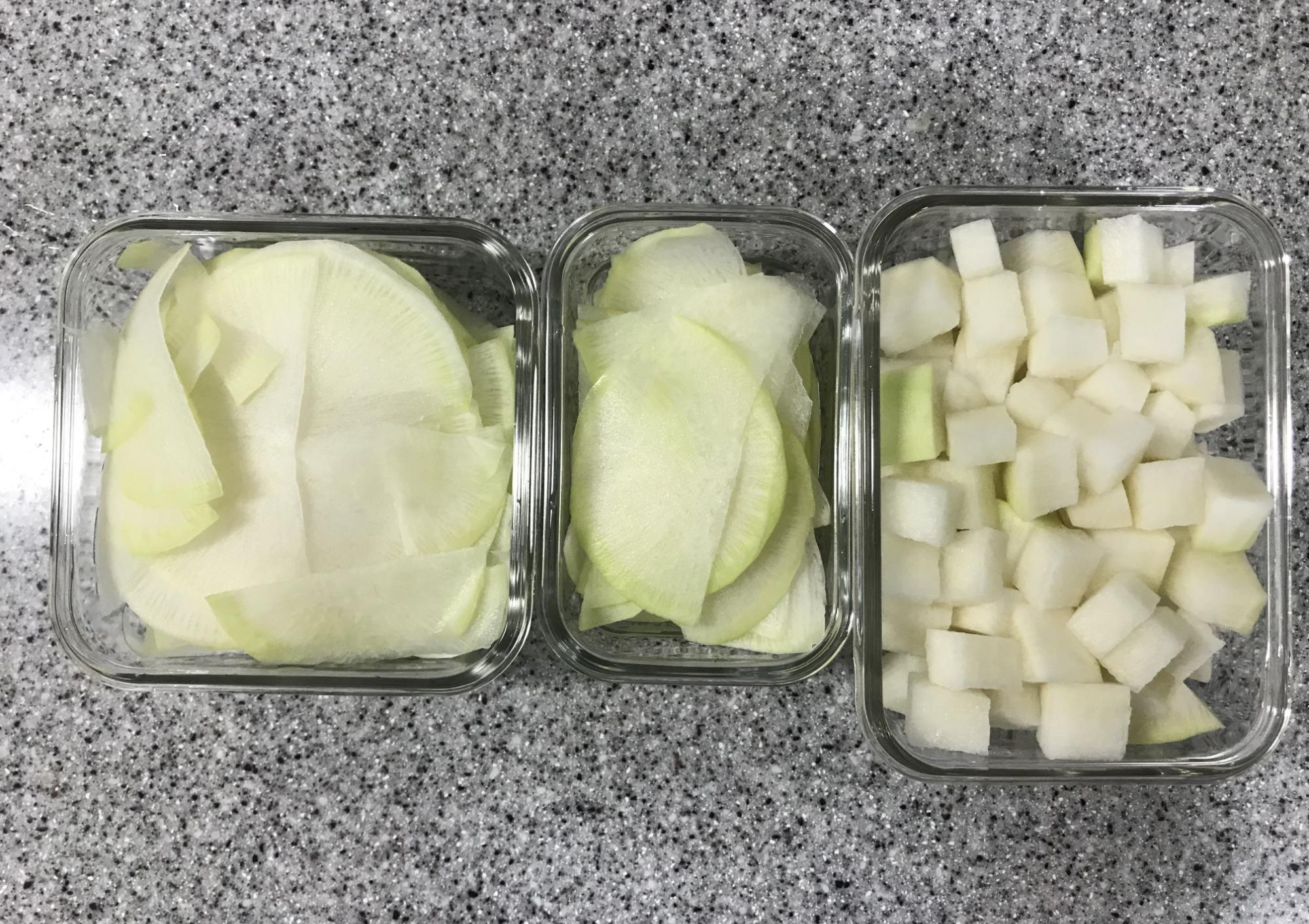 무를 썰어서 유리용기에 잘 담아줍니다.