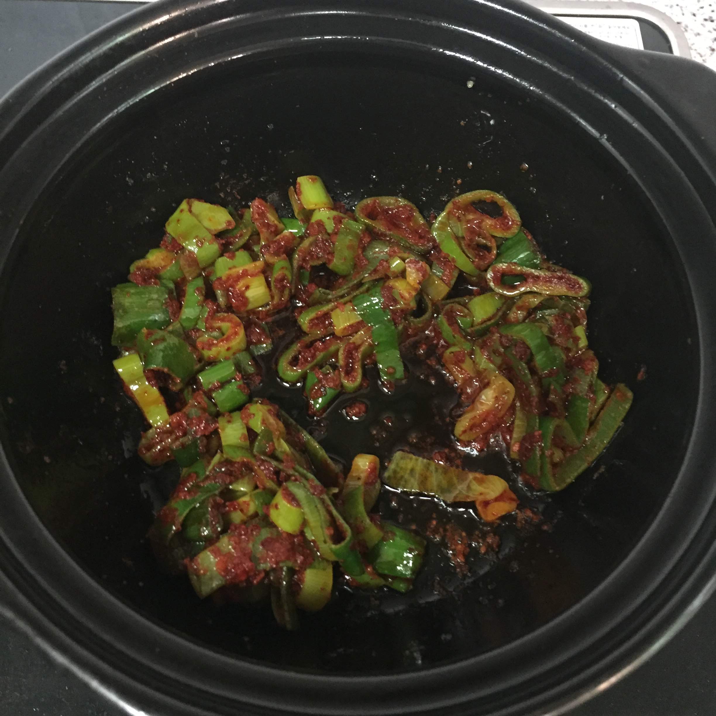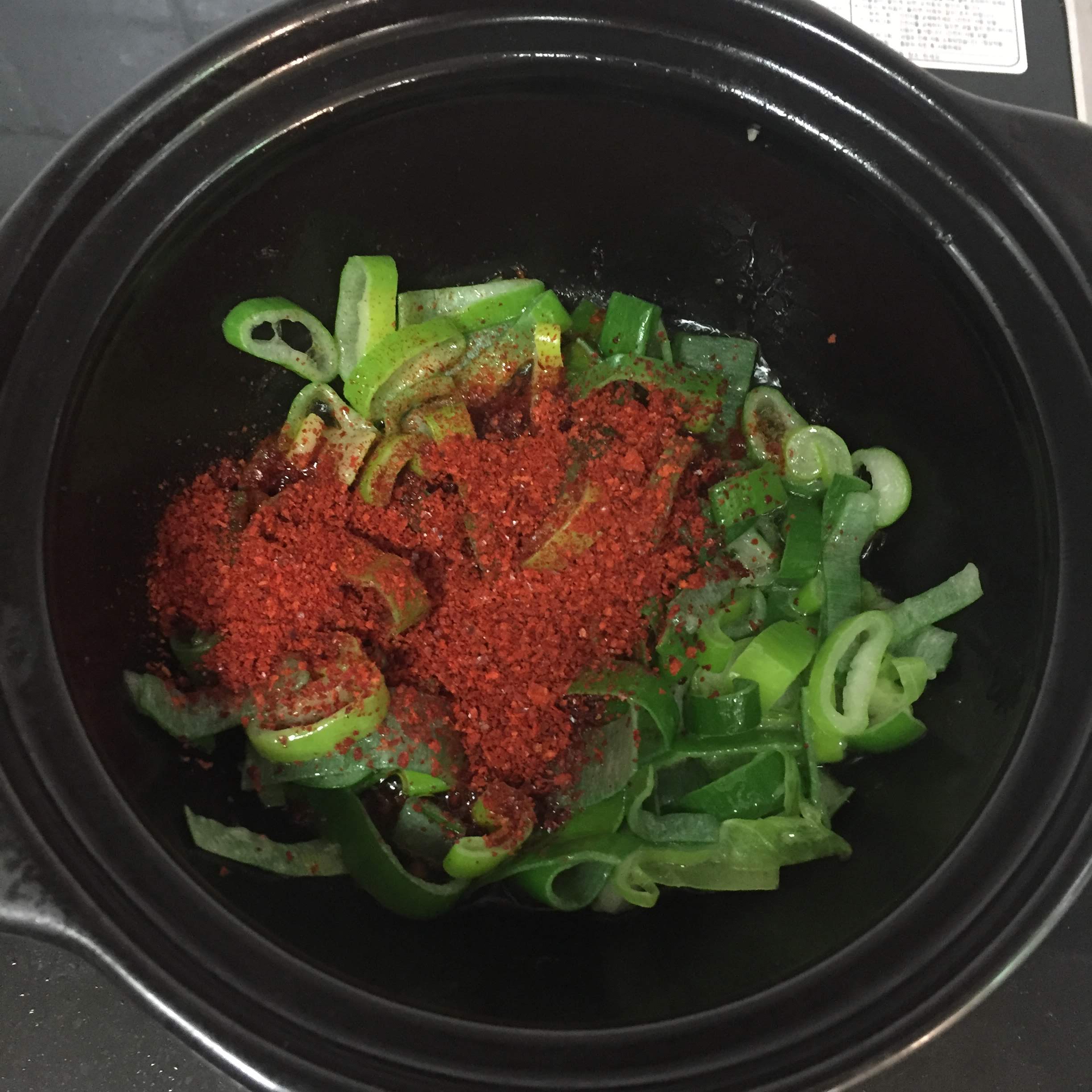 고춧가루와 파를 기름에 튀기듯 볶습니다.