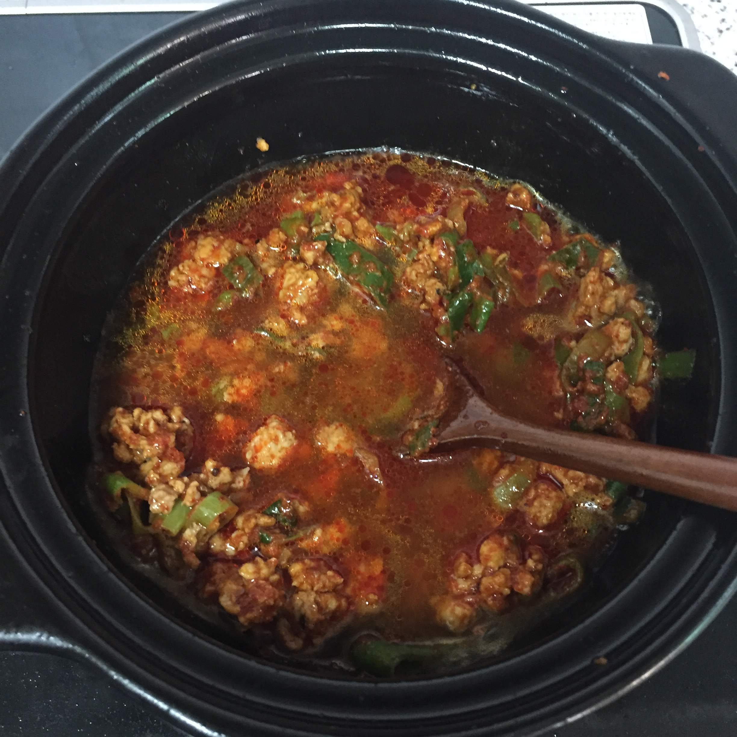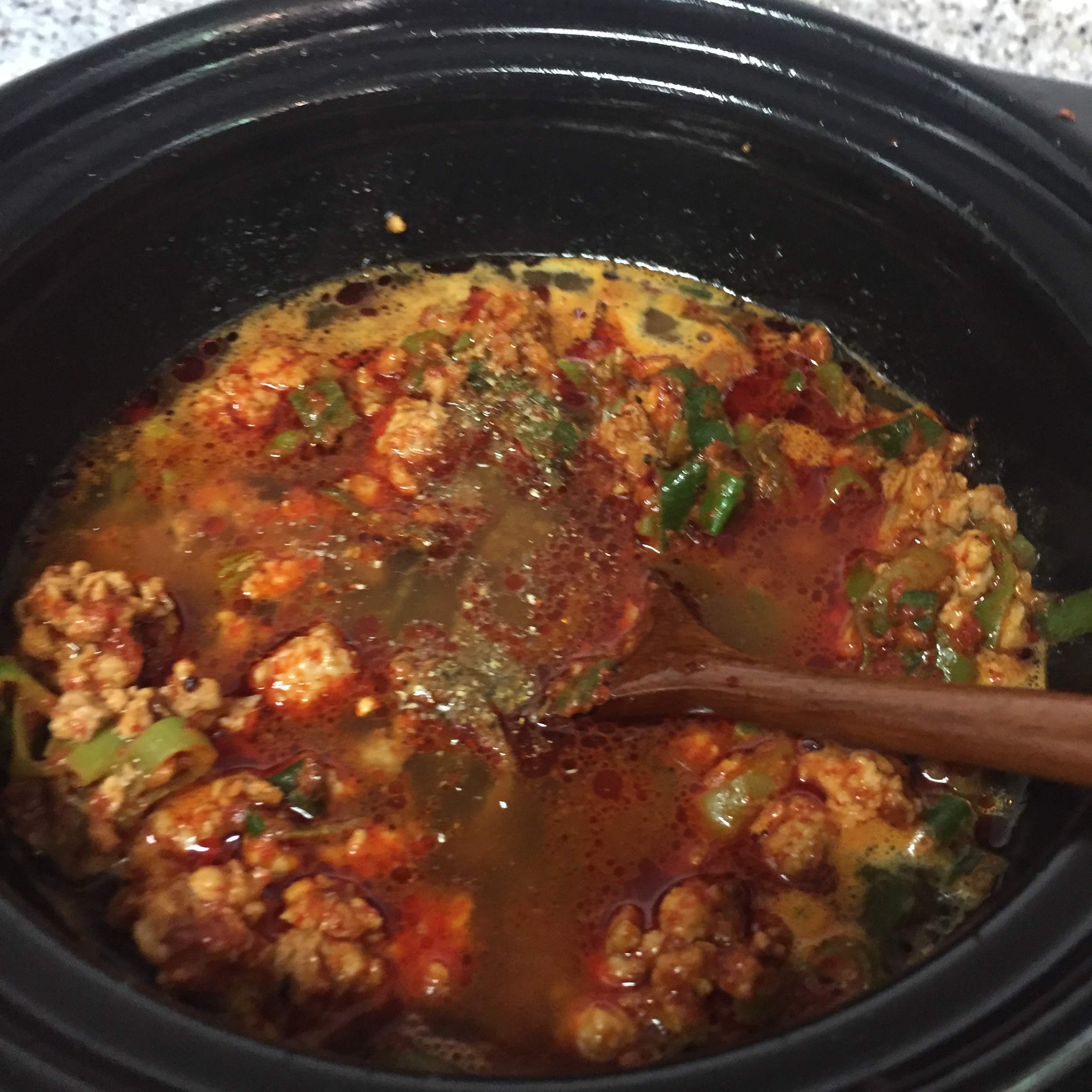 뚝배기가 달궈진 남은 열로 고추기름을 냅니다.