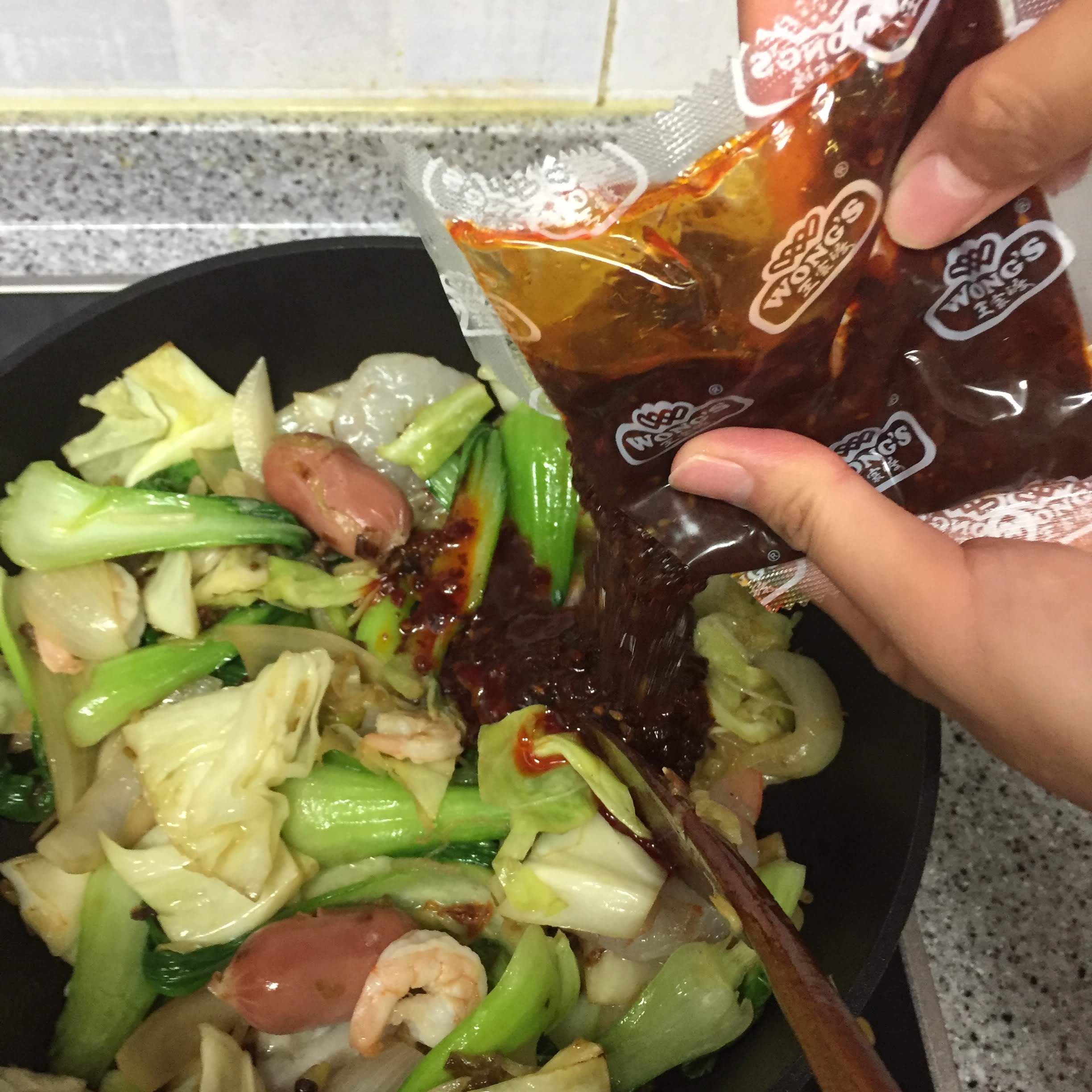 숨죽은 야채 위로 뿌려줍니다. (어느샌가 소세지도 넣었습니다)