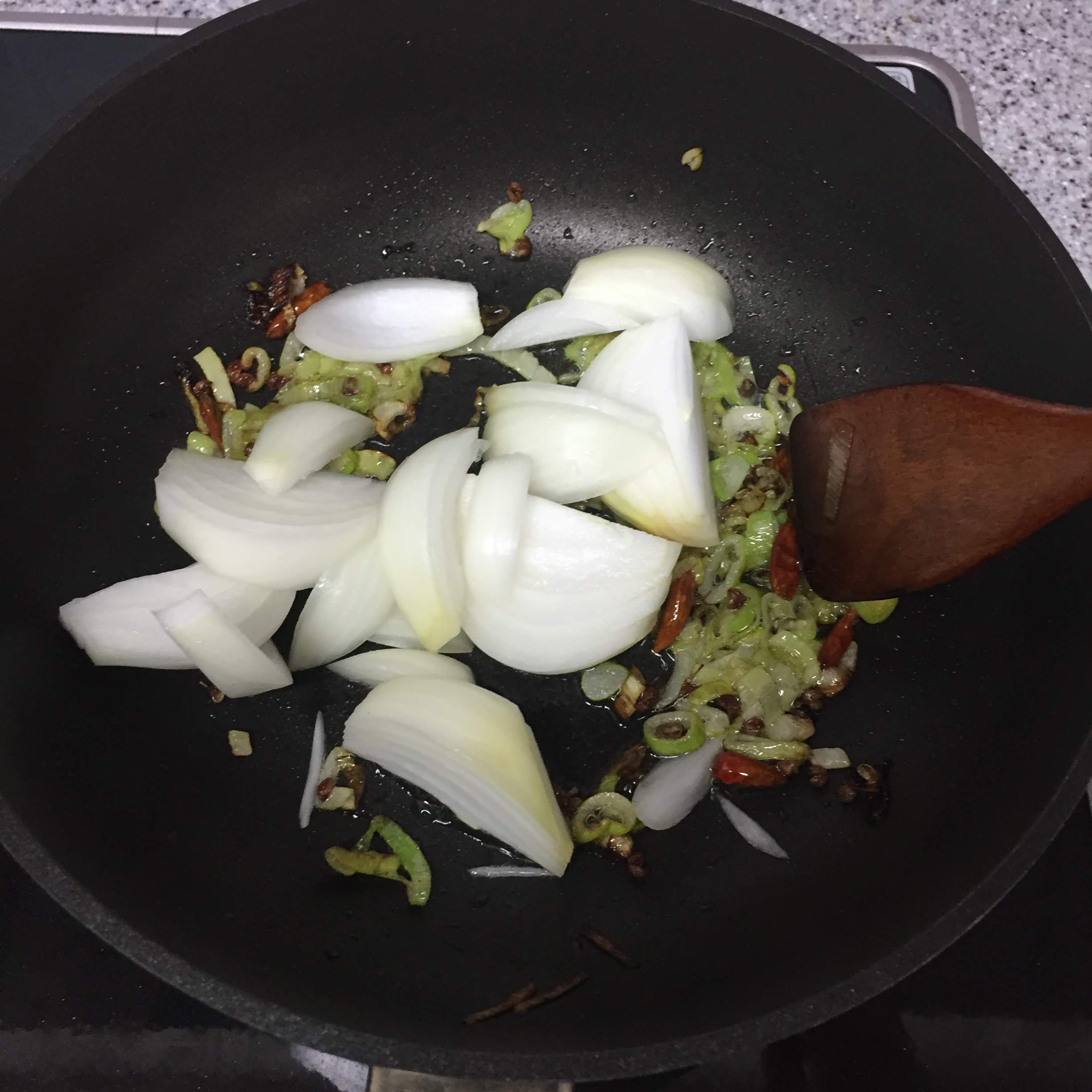어느정도 매운맛을 기름에 입혔으면 양파를 넣고 볶습니다.
