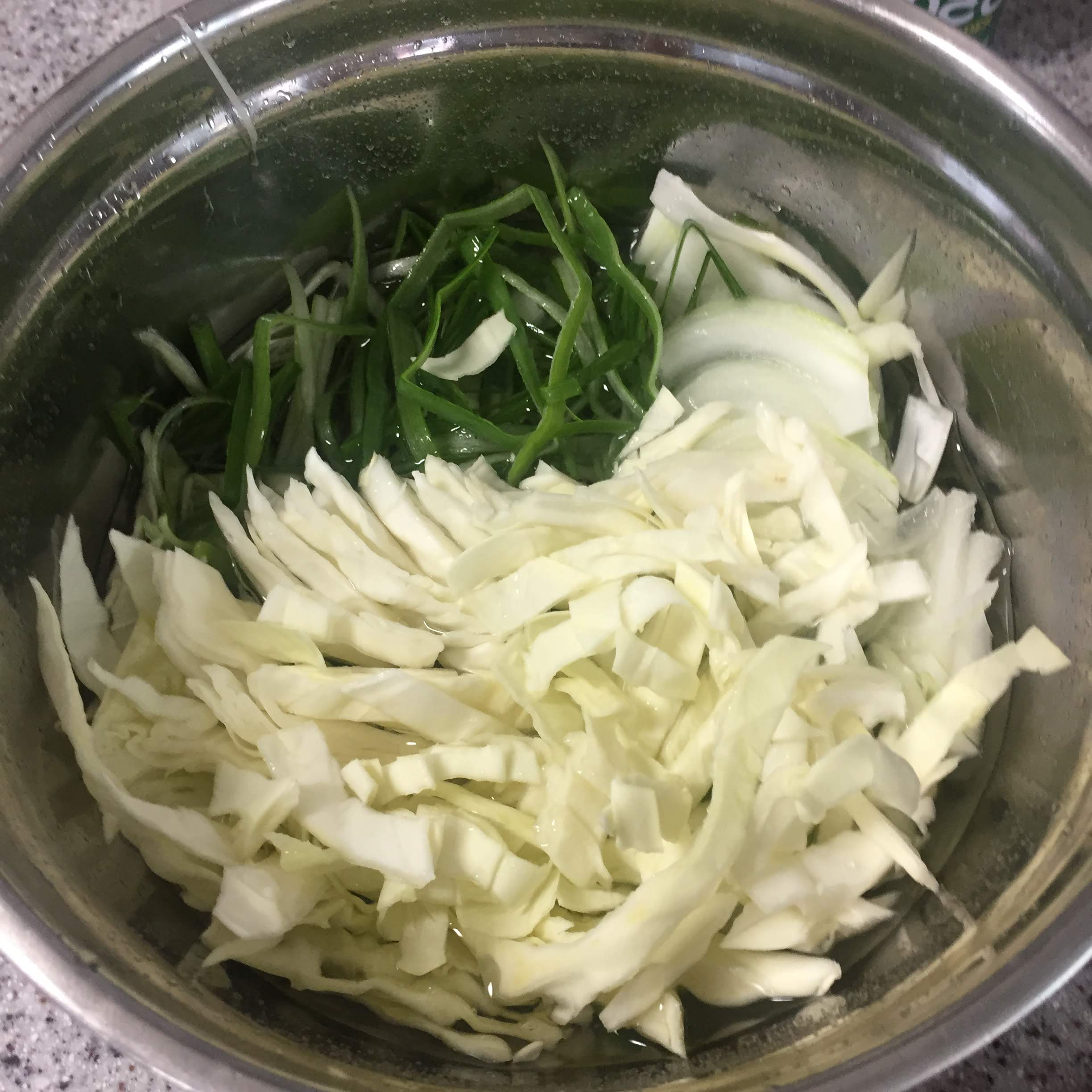 파, 양배추, 양파를 한데 물에 담가둡니다.