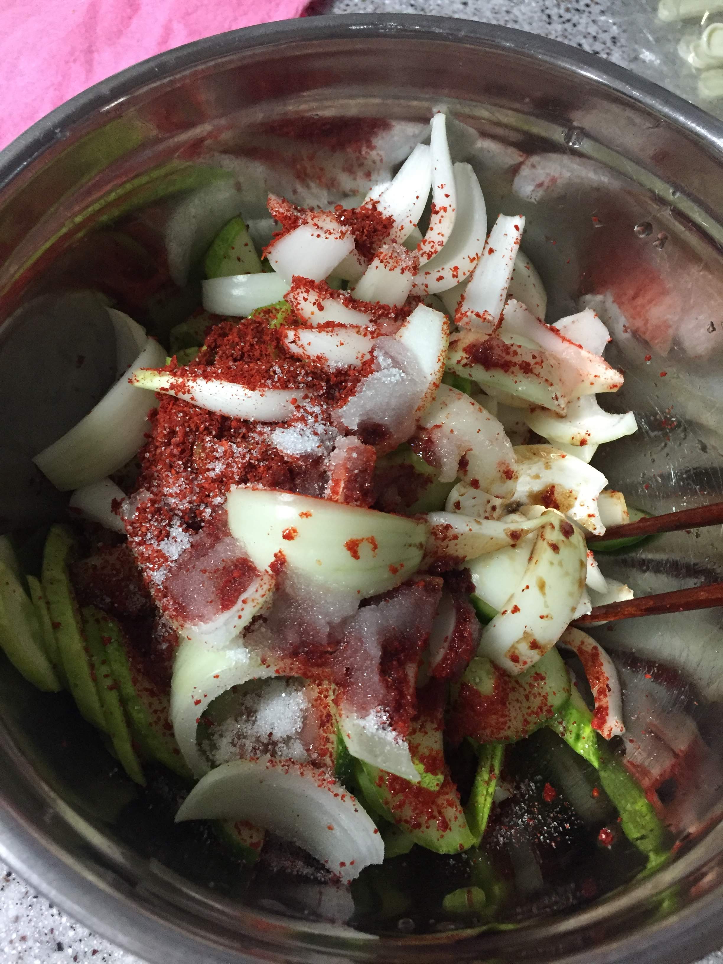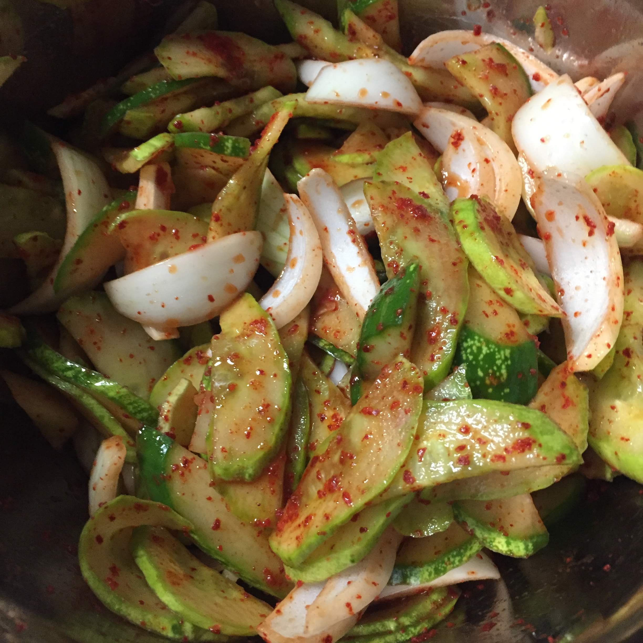 절여진 오이에서 나온 물.