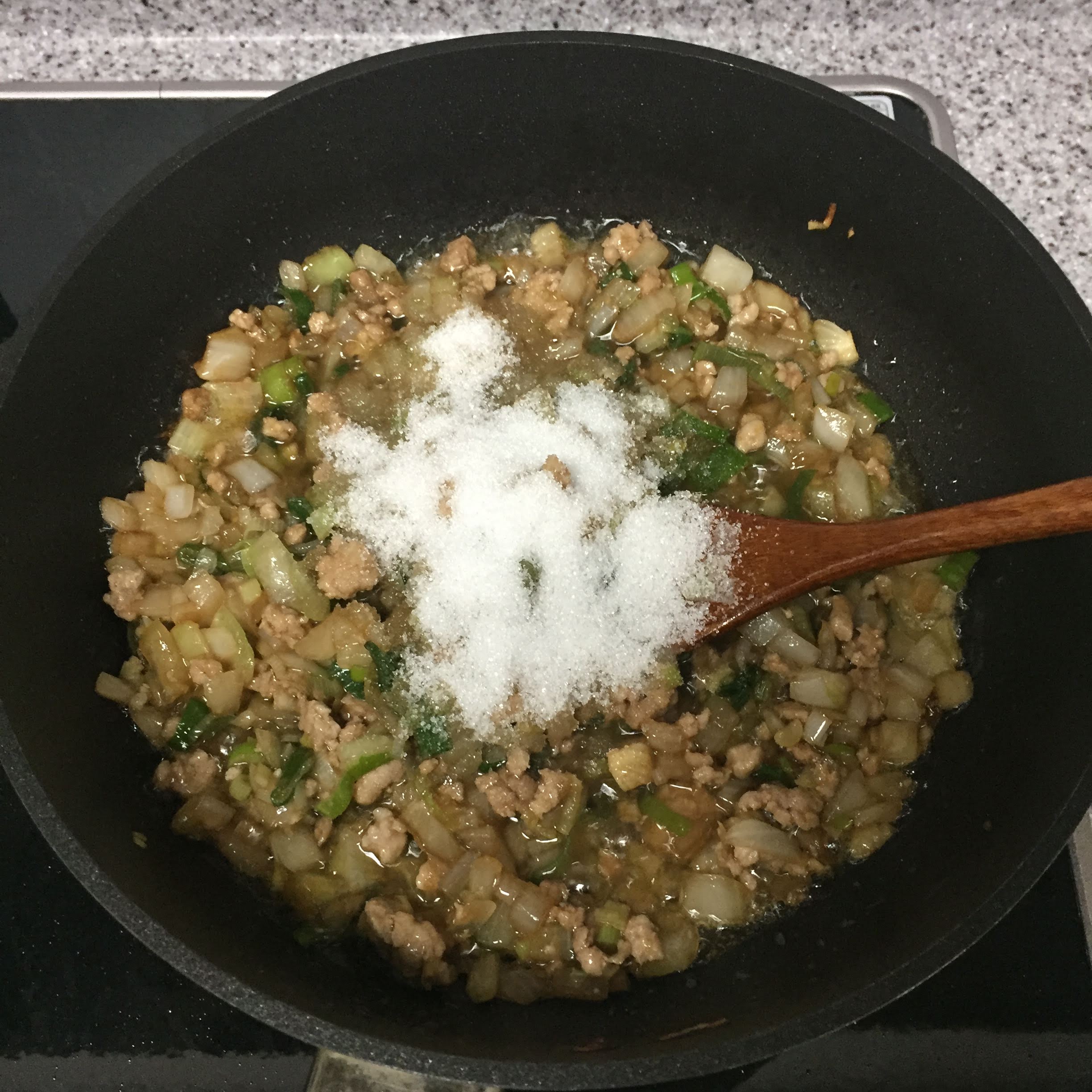 여기서 설탕을 넣고 볶아줍니다.
