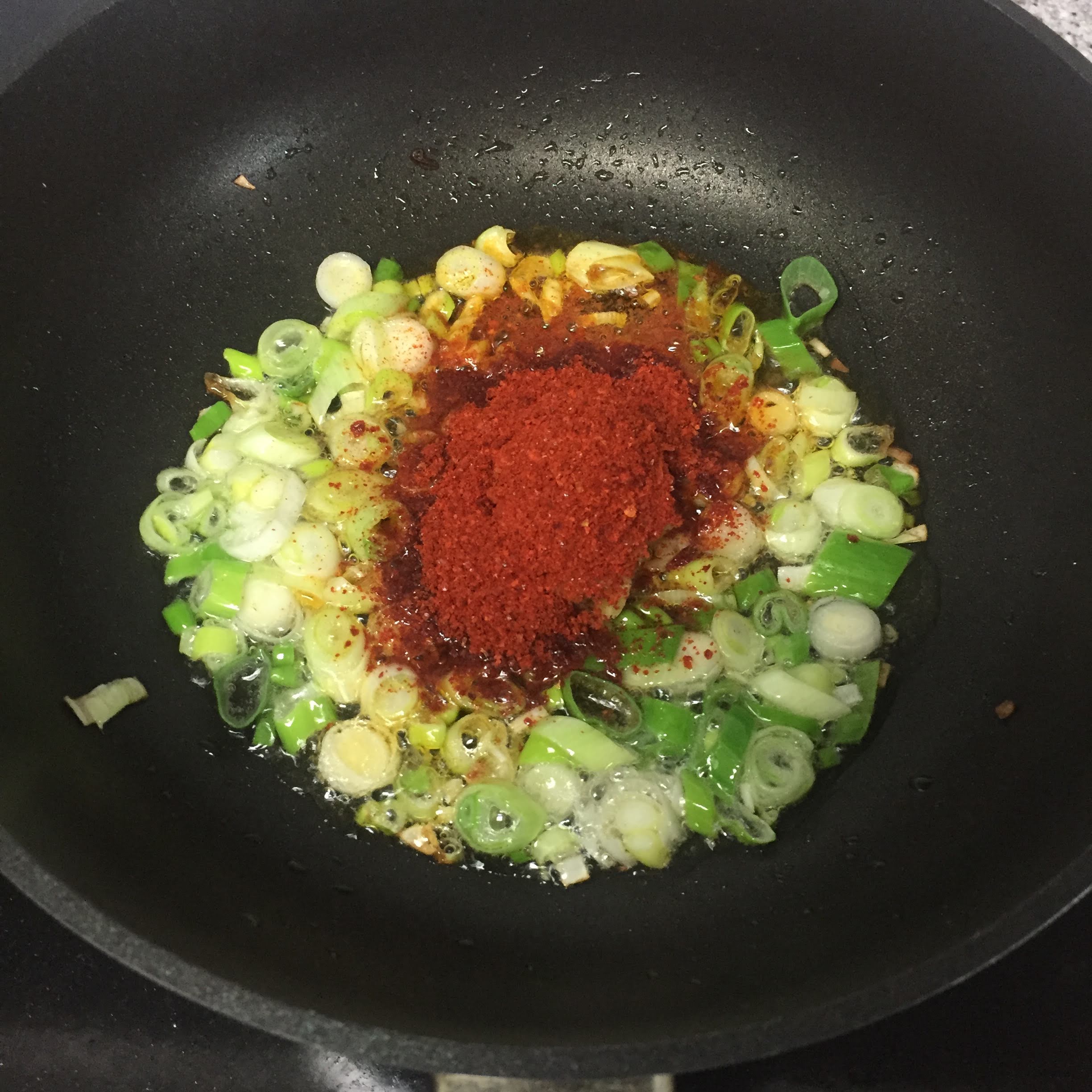끓는기름에 고춧가루를 넣어서
