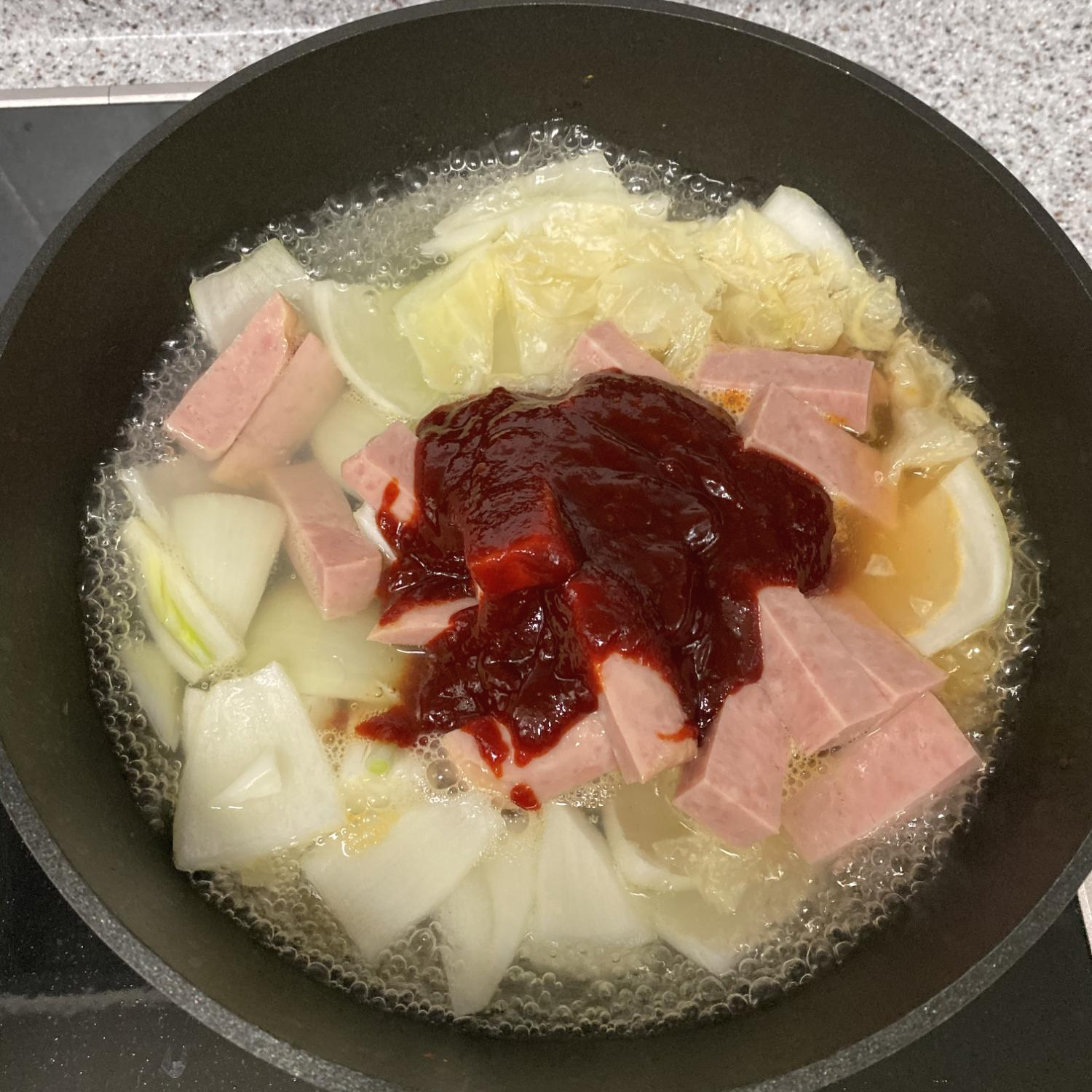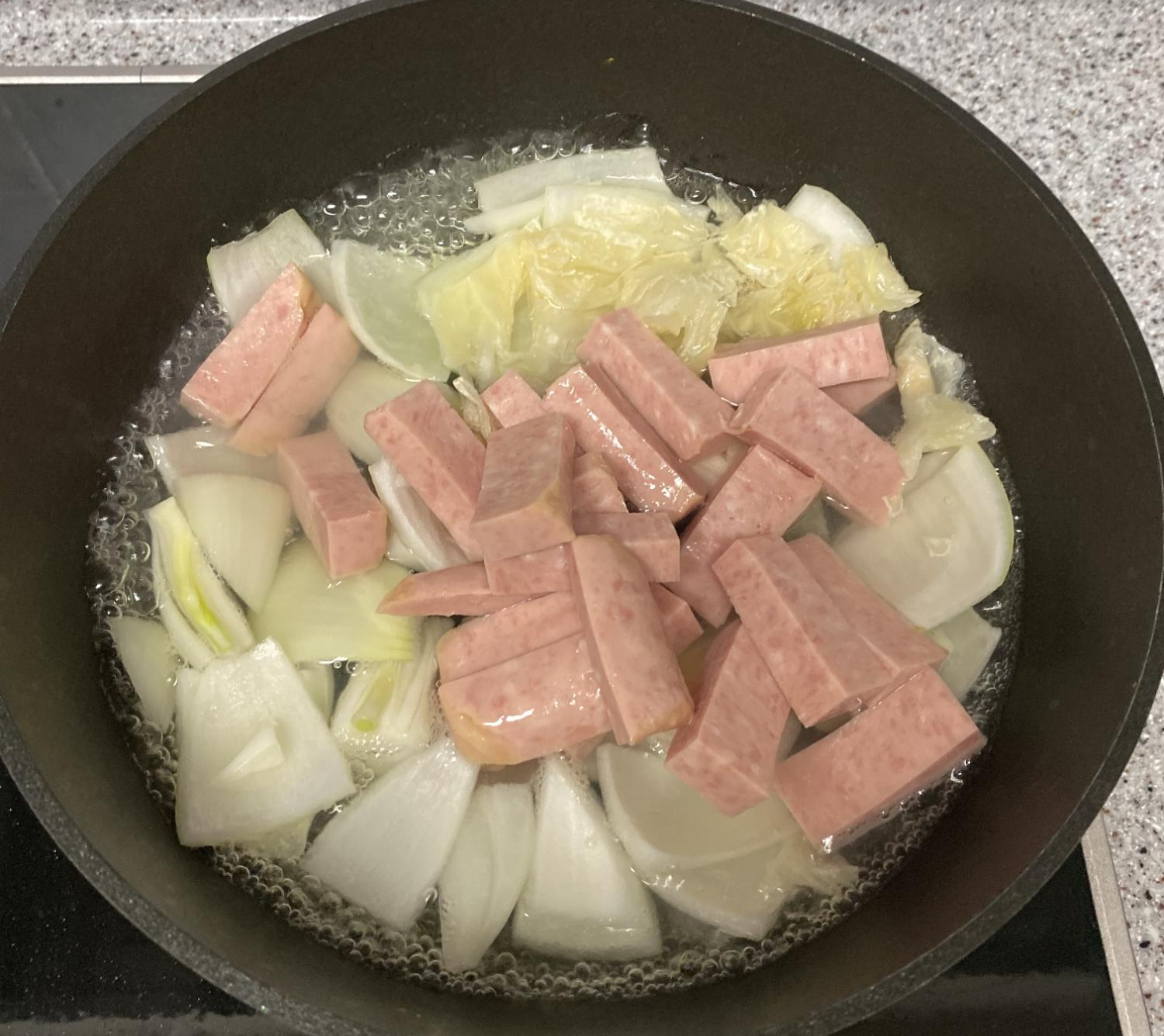 대충 양파/양배추/스팸을 썰어 넣습니다.