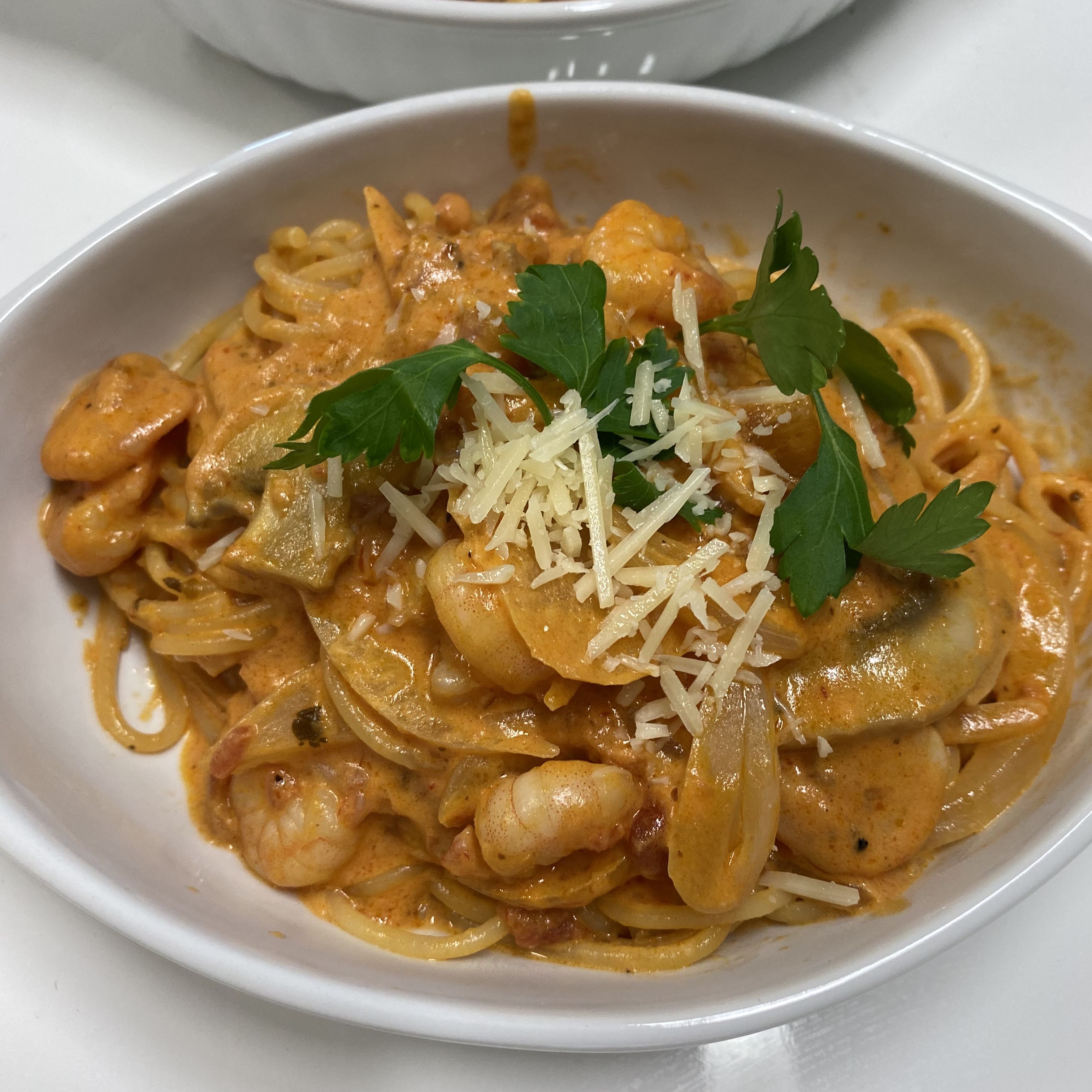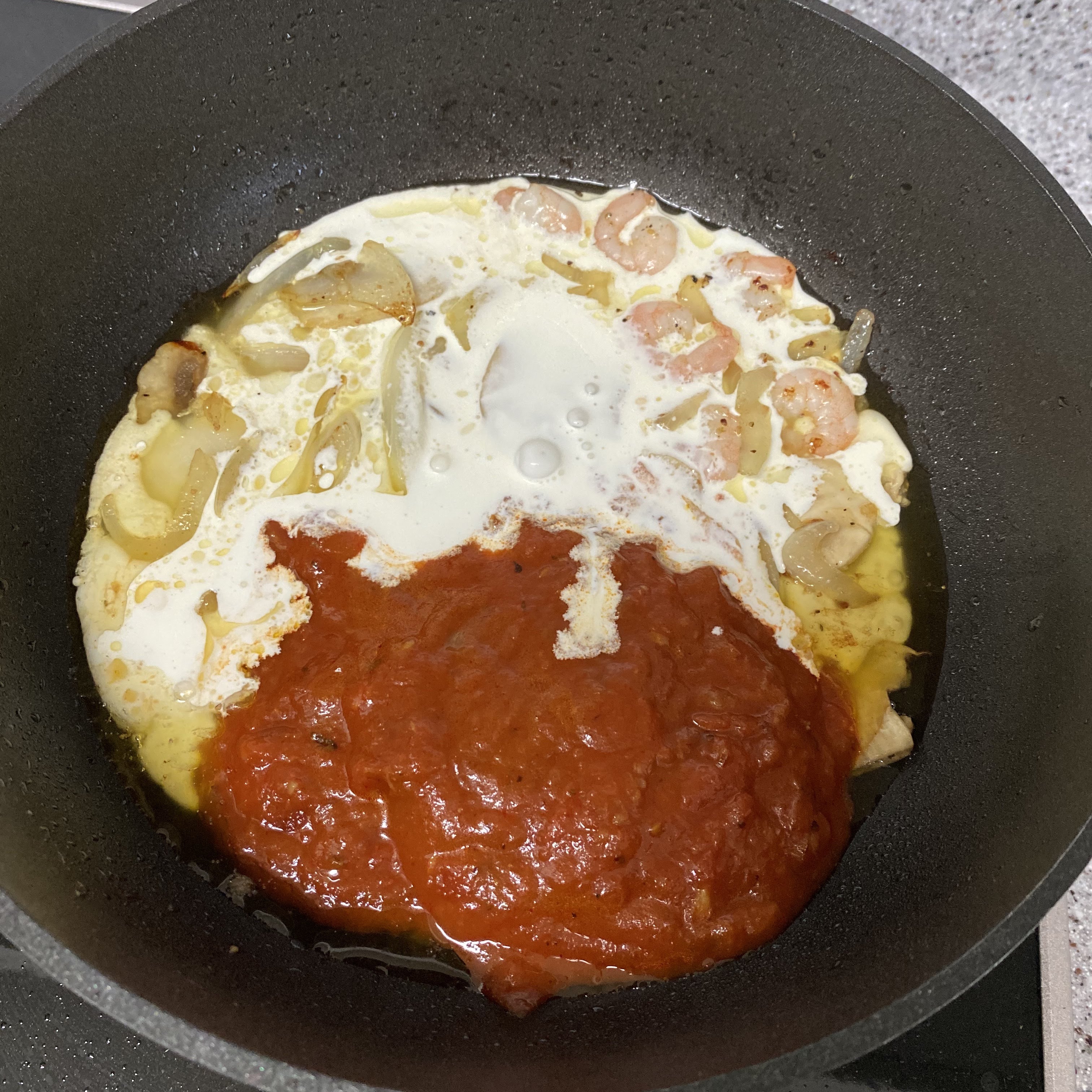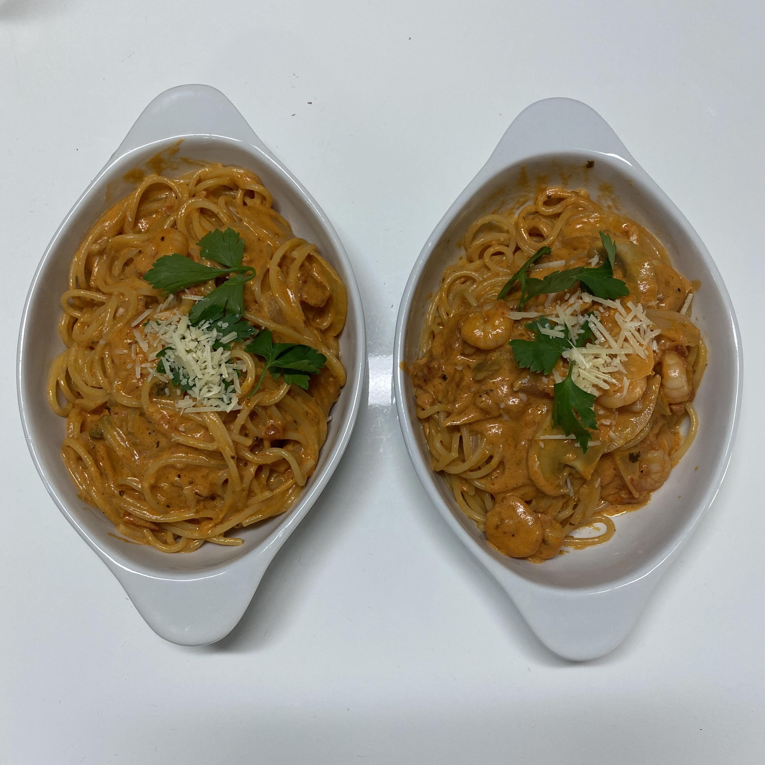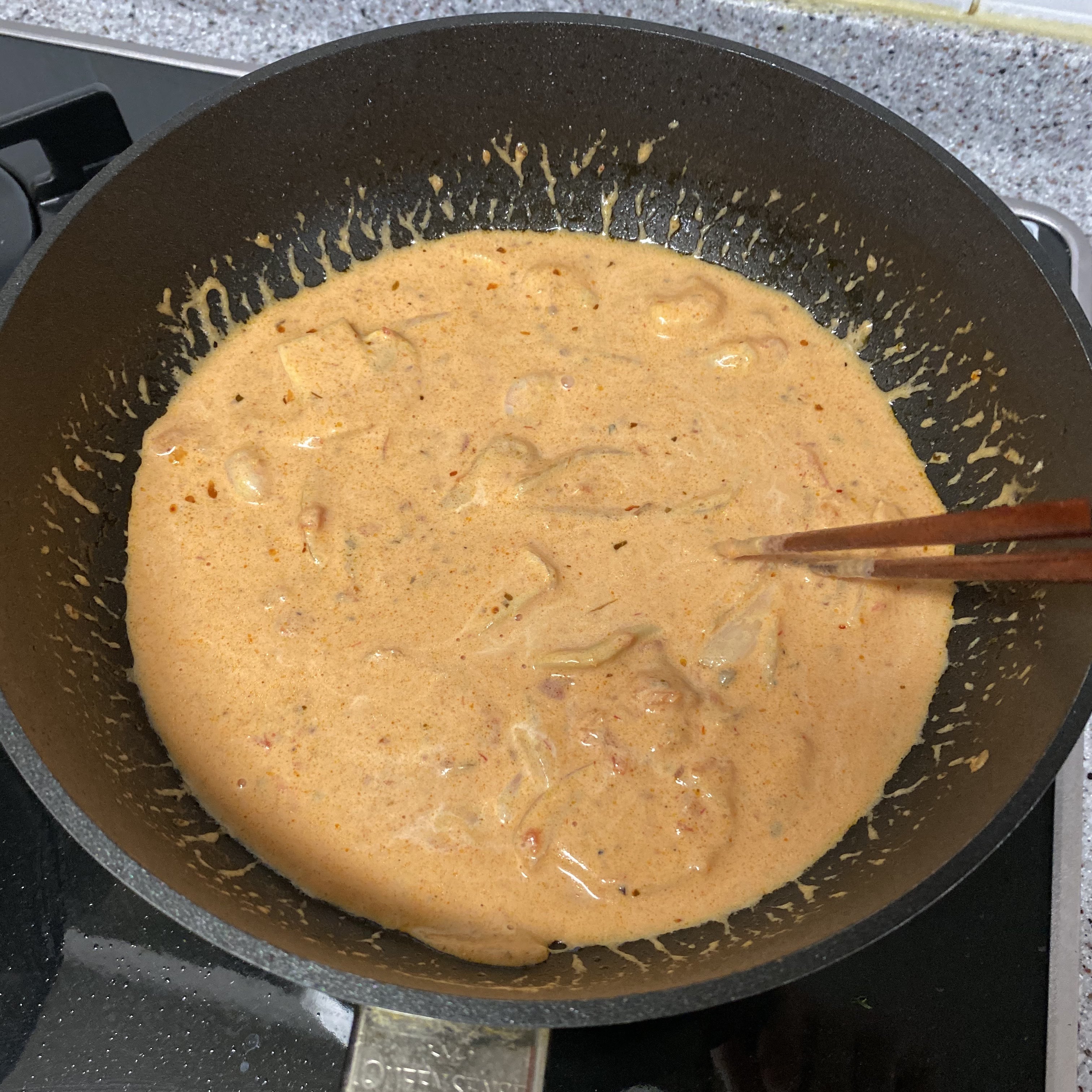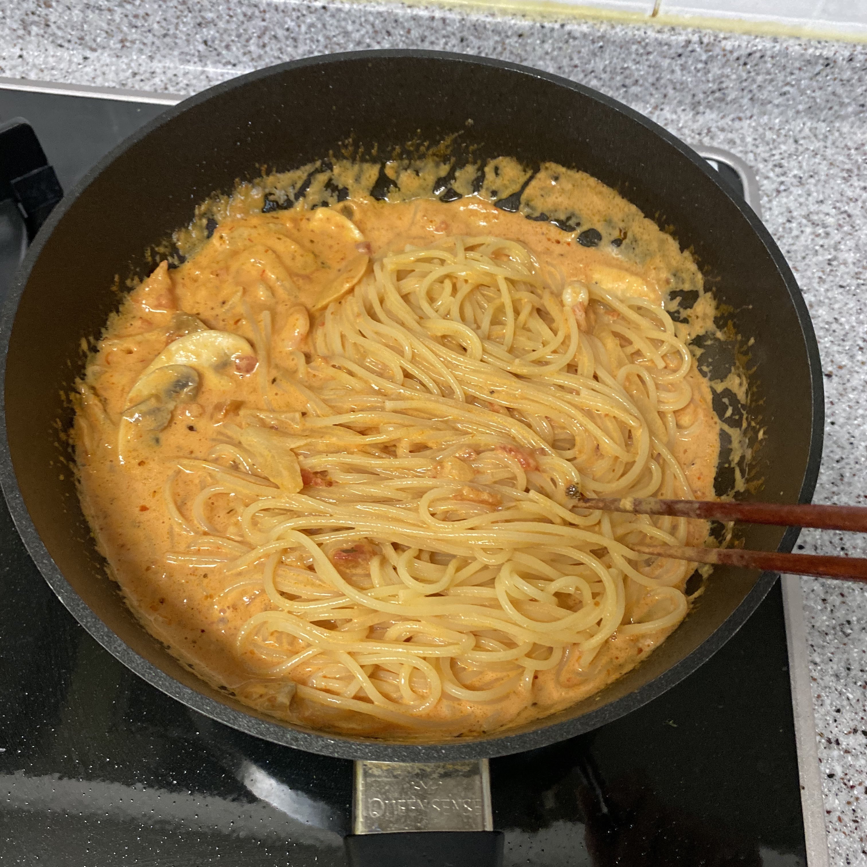 잘 섞으면 분홍색 로제파스타가 됩니다.