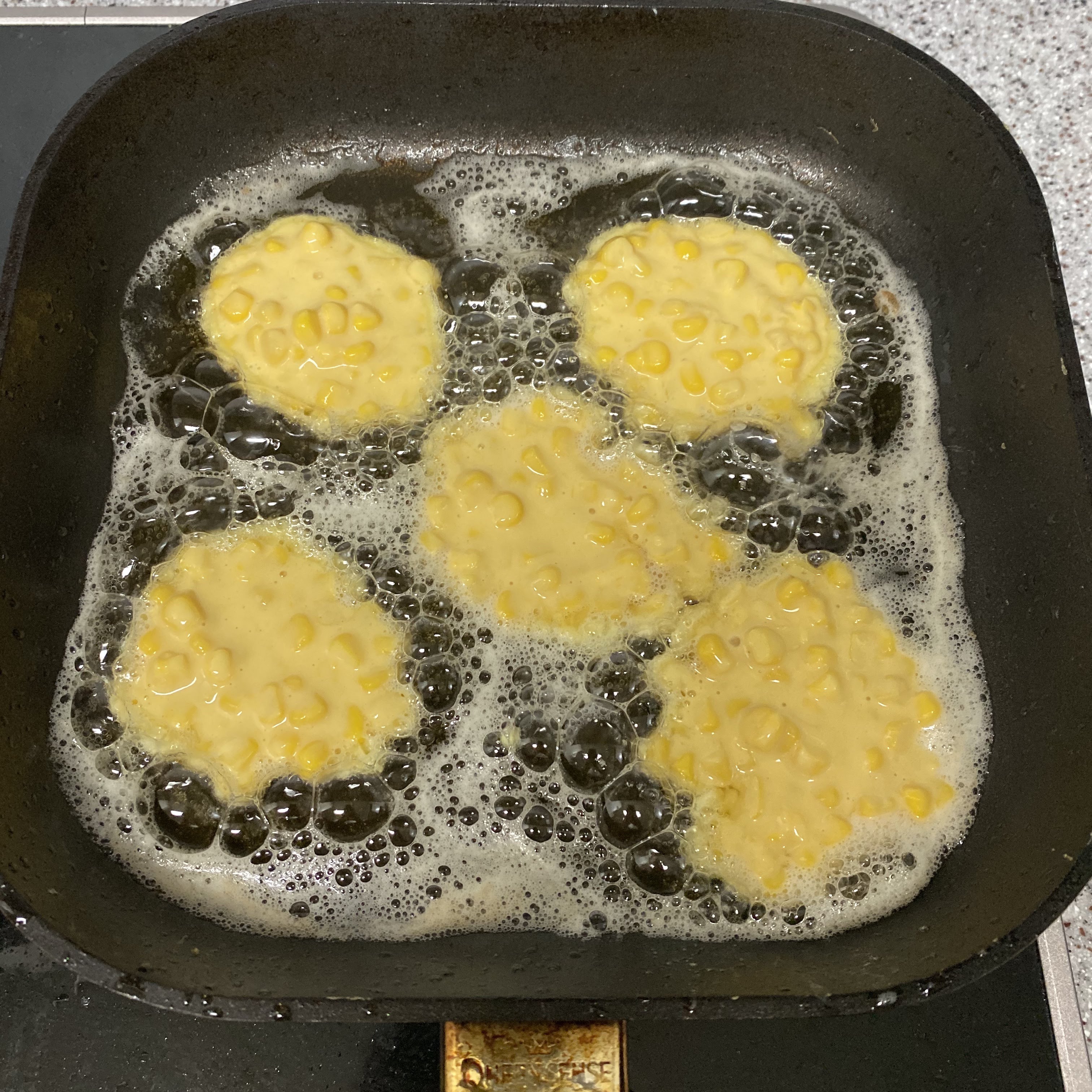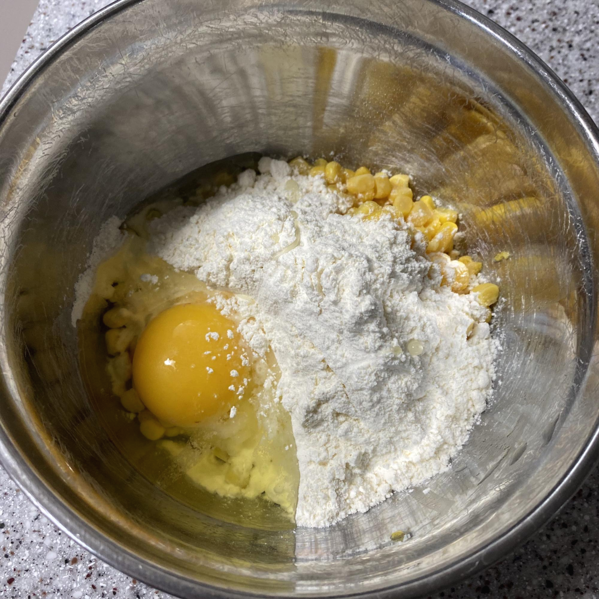 옥수수와 부침가루를 1:1로 하고 계란을 섞으면