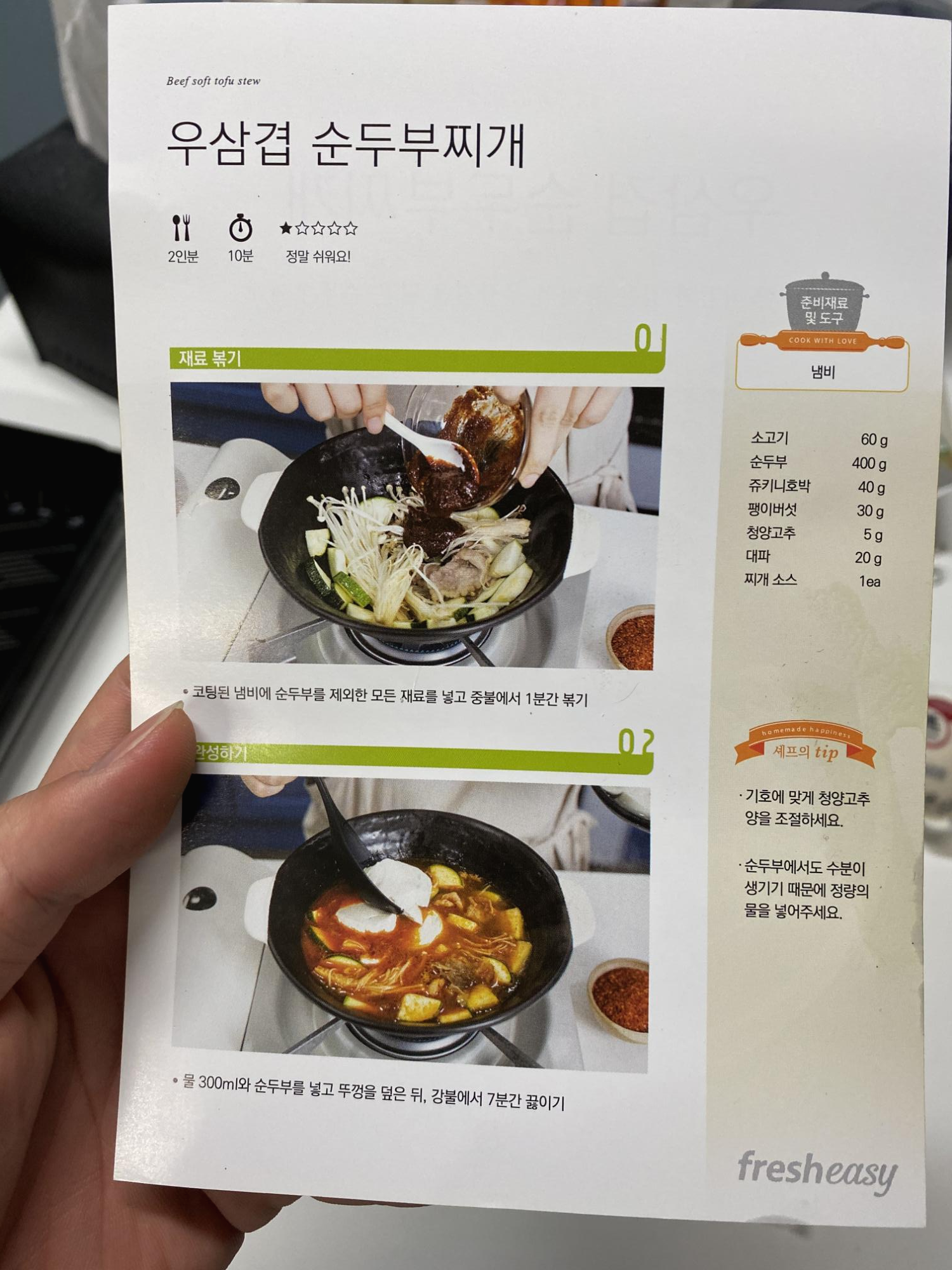 내용물은 고기, 순두부, 양념, 채소류.