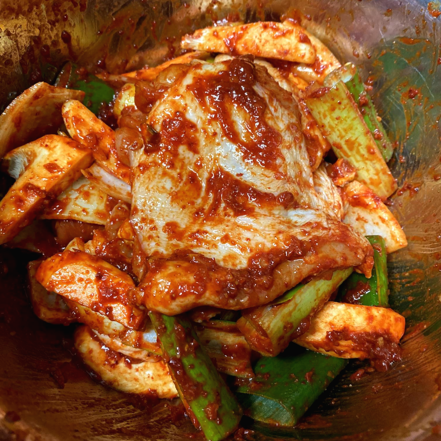 닭 정육은 재울때 좀 토막을 쳐서