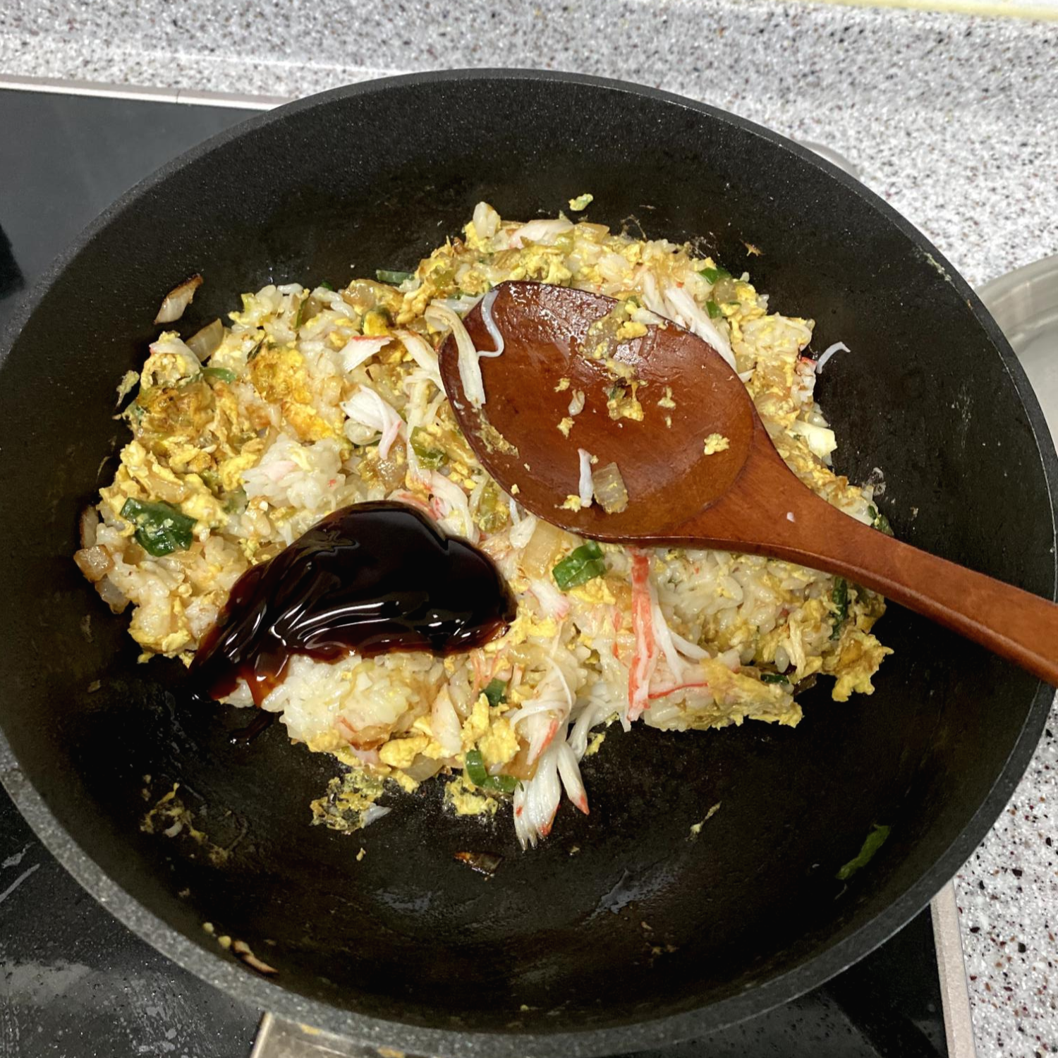 휘휘 섞어 볶으며 간장향을 고루 입힙니다.