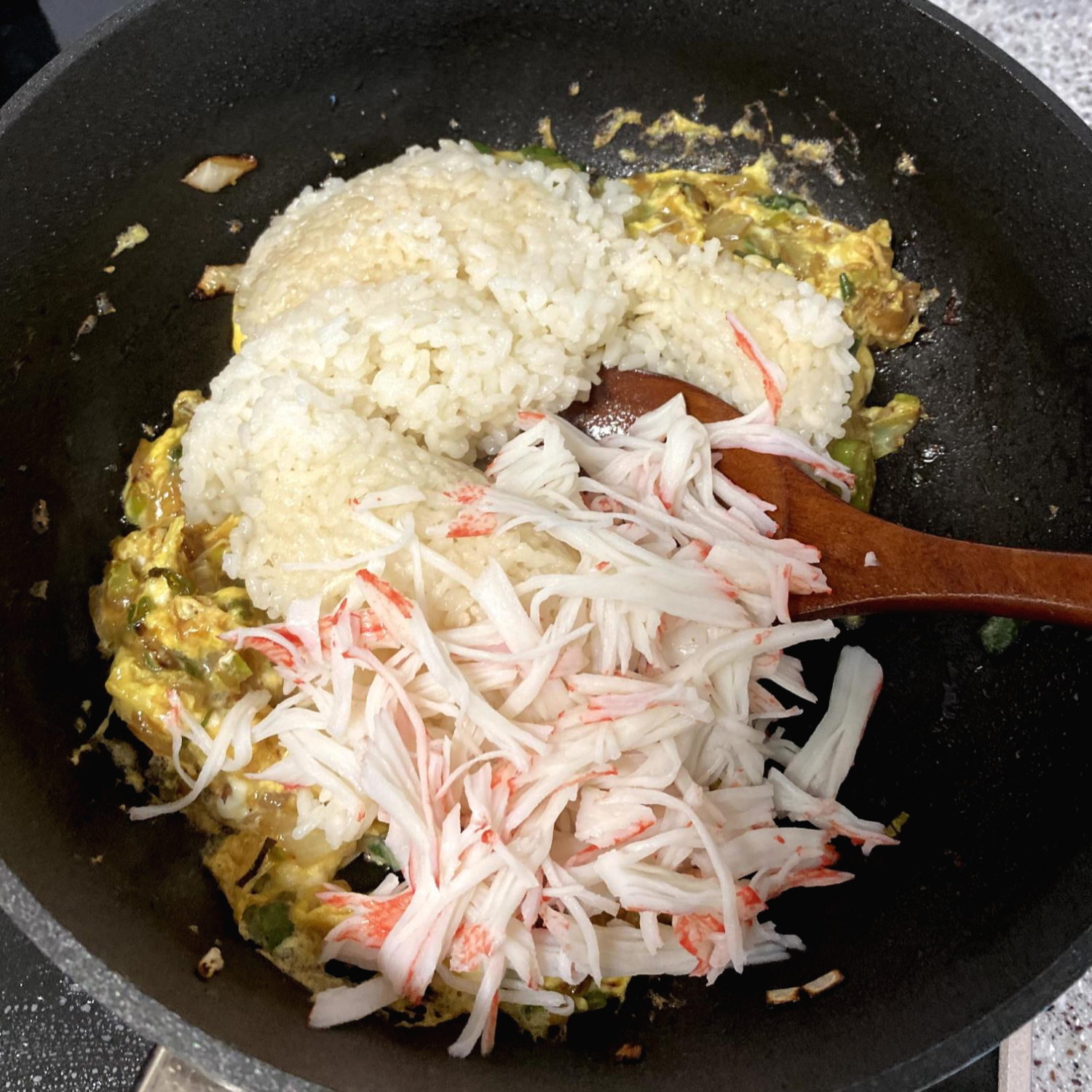 밥과 게맛살을 넣구요