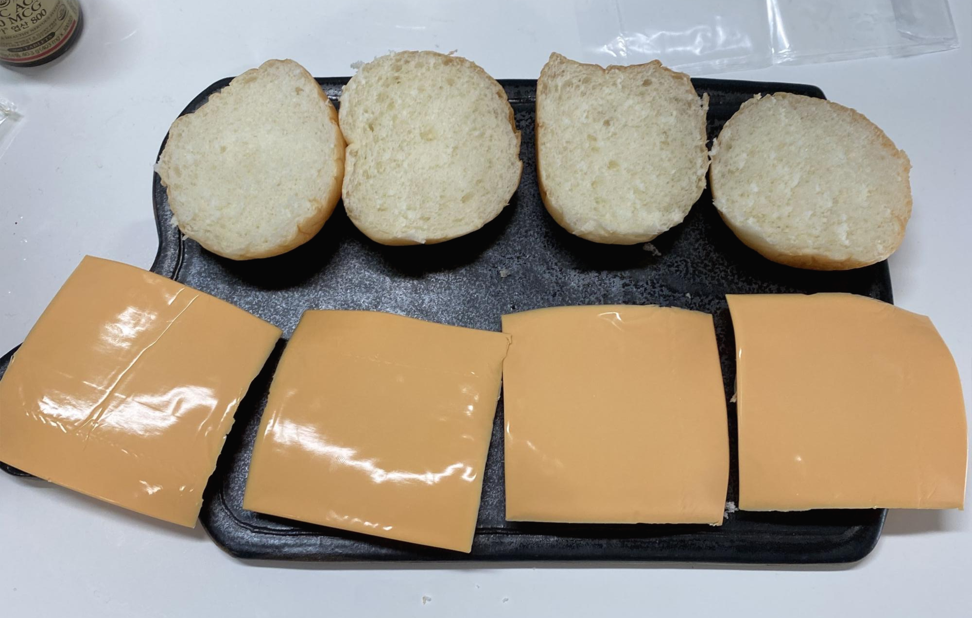 모닝빵을 반 잘라서 치즈를 올려줍니다.