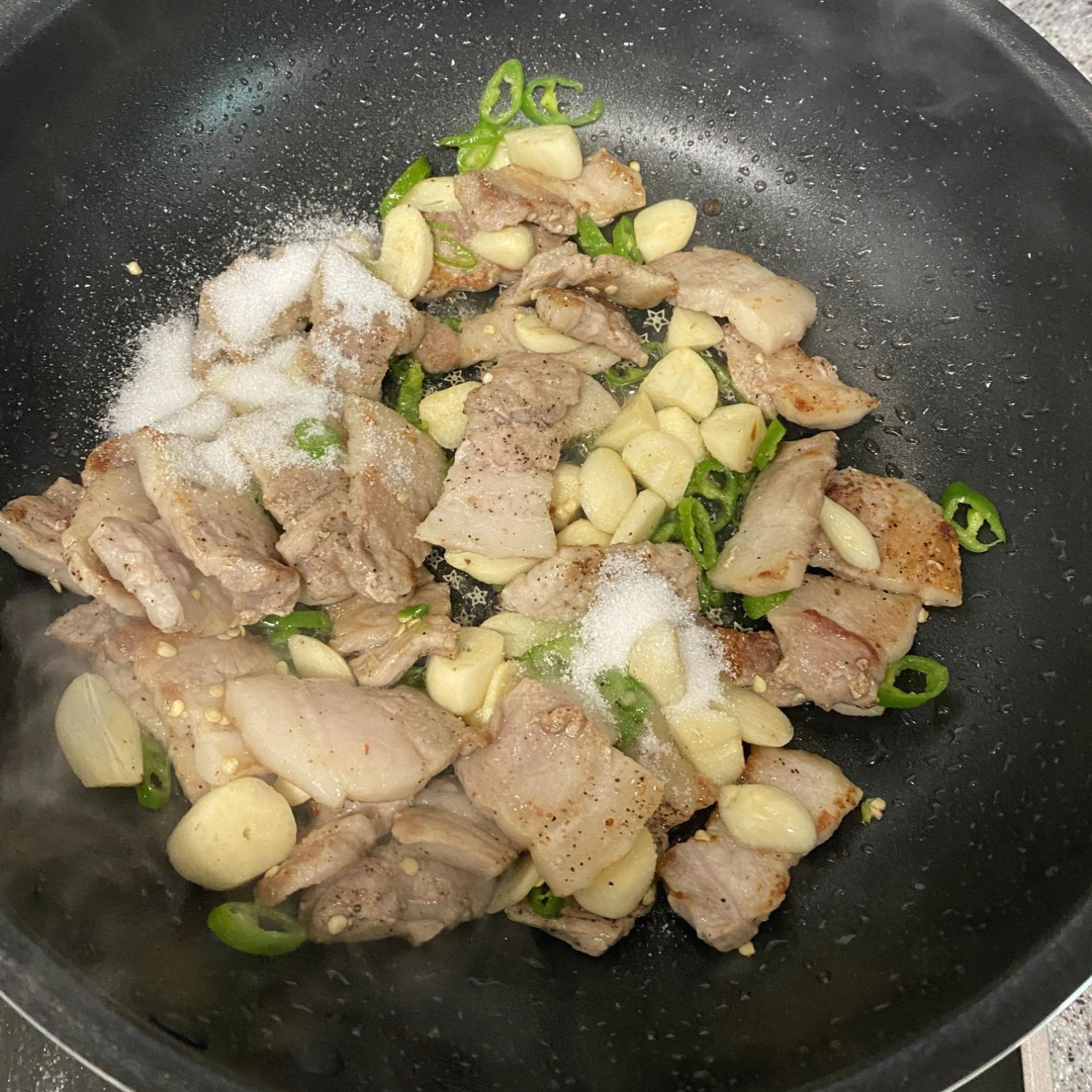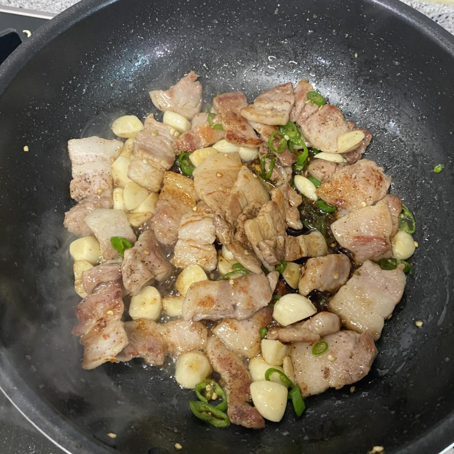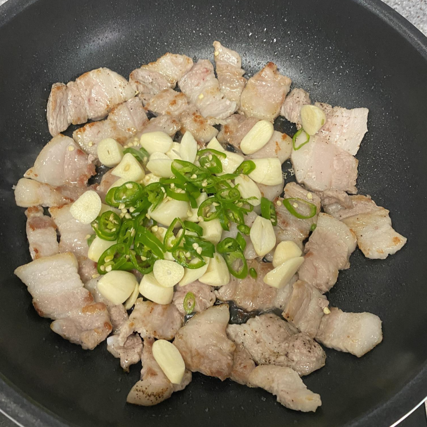 삼겹살을 앞뒤로 뒤집어 노릇하게 구워주고