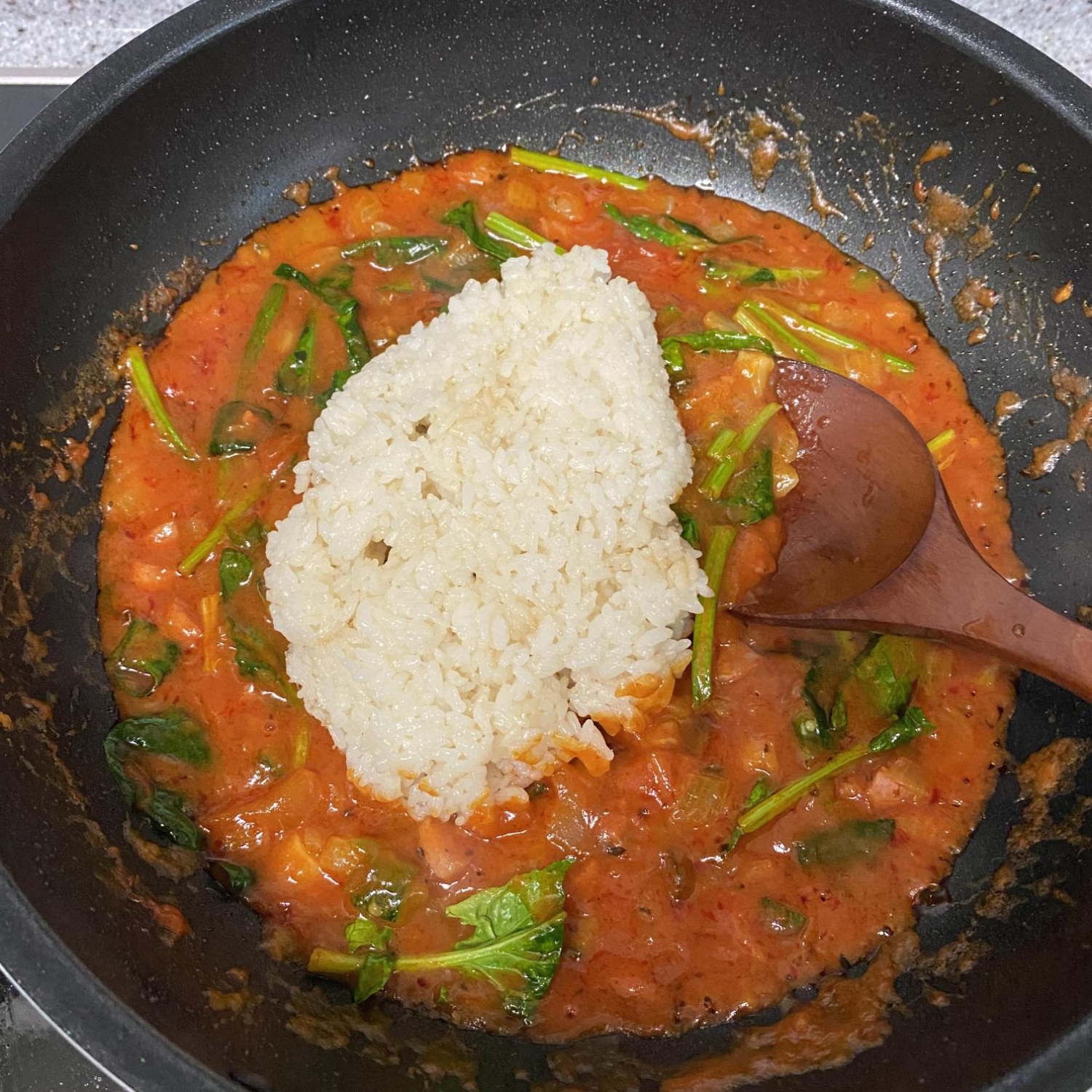밥을 한덩이 넣고 잘 섞으며 데워줍니다.