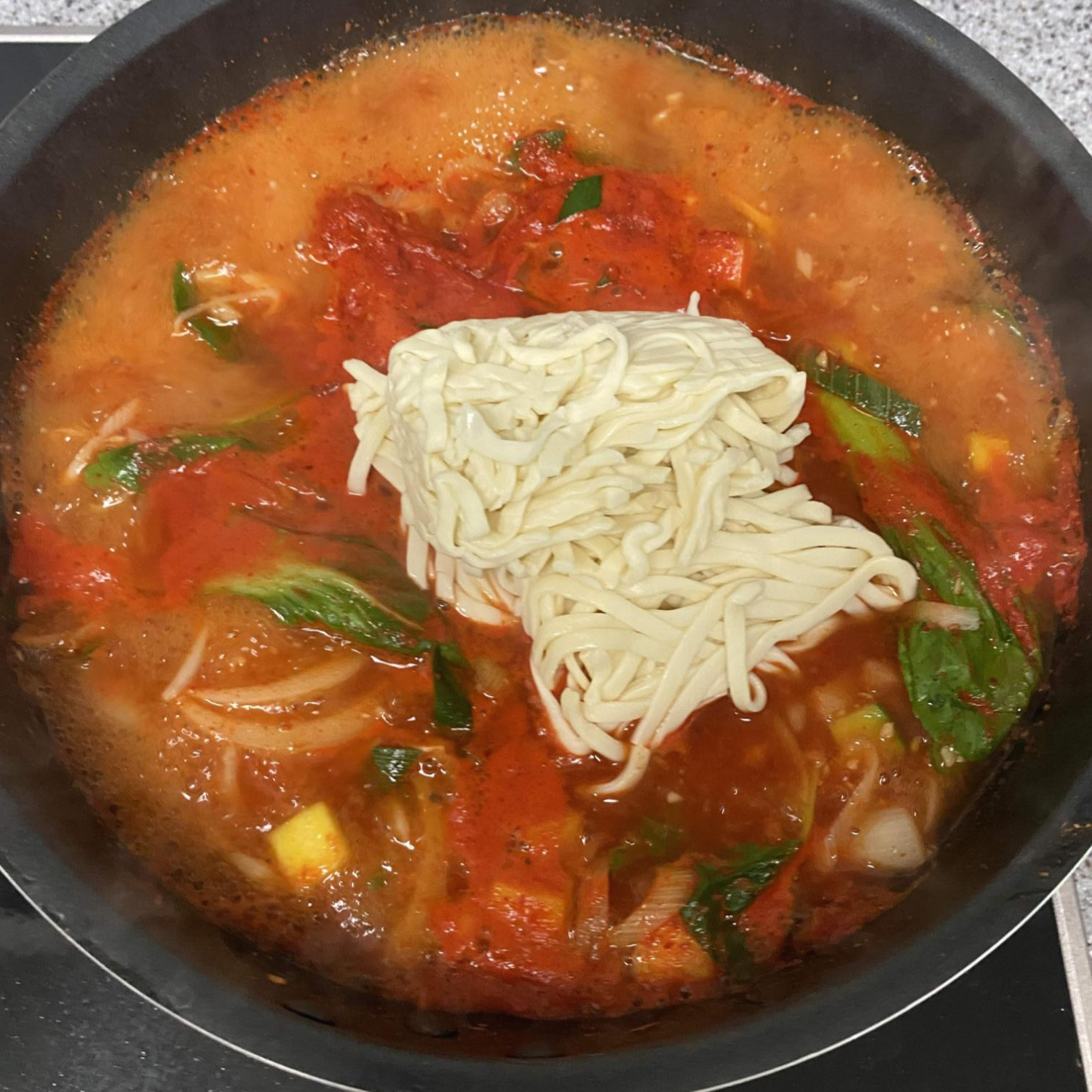 이제 칼국수를 넣고 잘 풀어서 삶아줍니다.