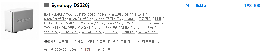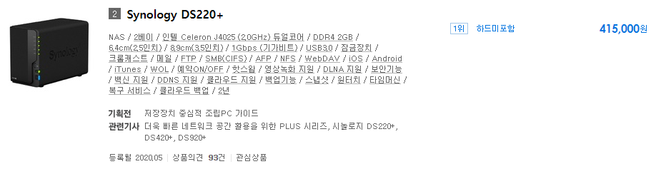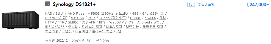 그래서 4베이 고급형 모델인 DS920+가 다나와 기준 1등인 이유가 설명이 됩니다.