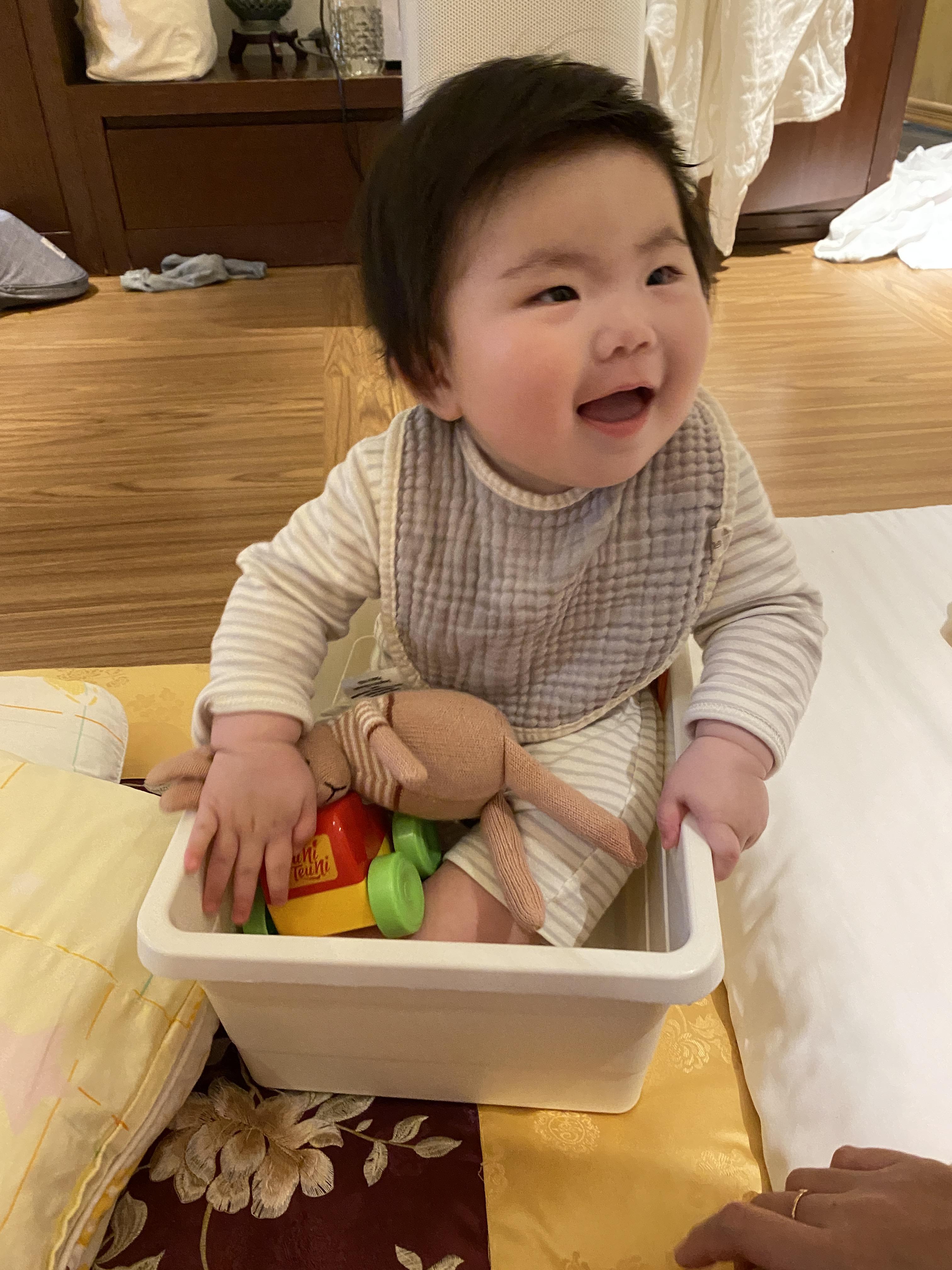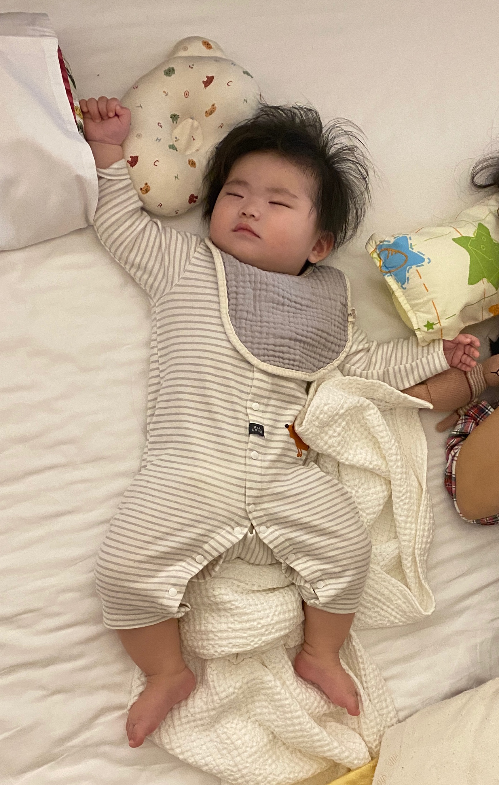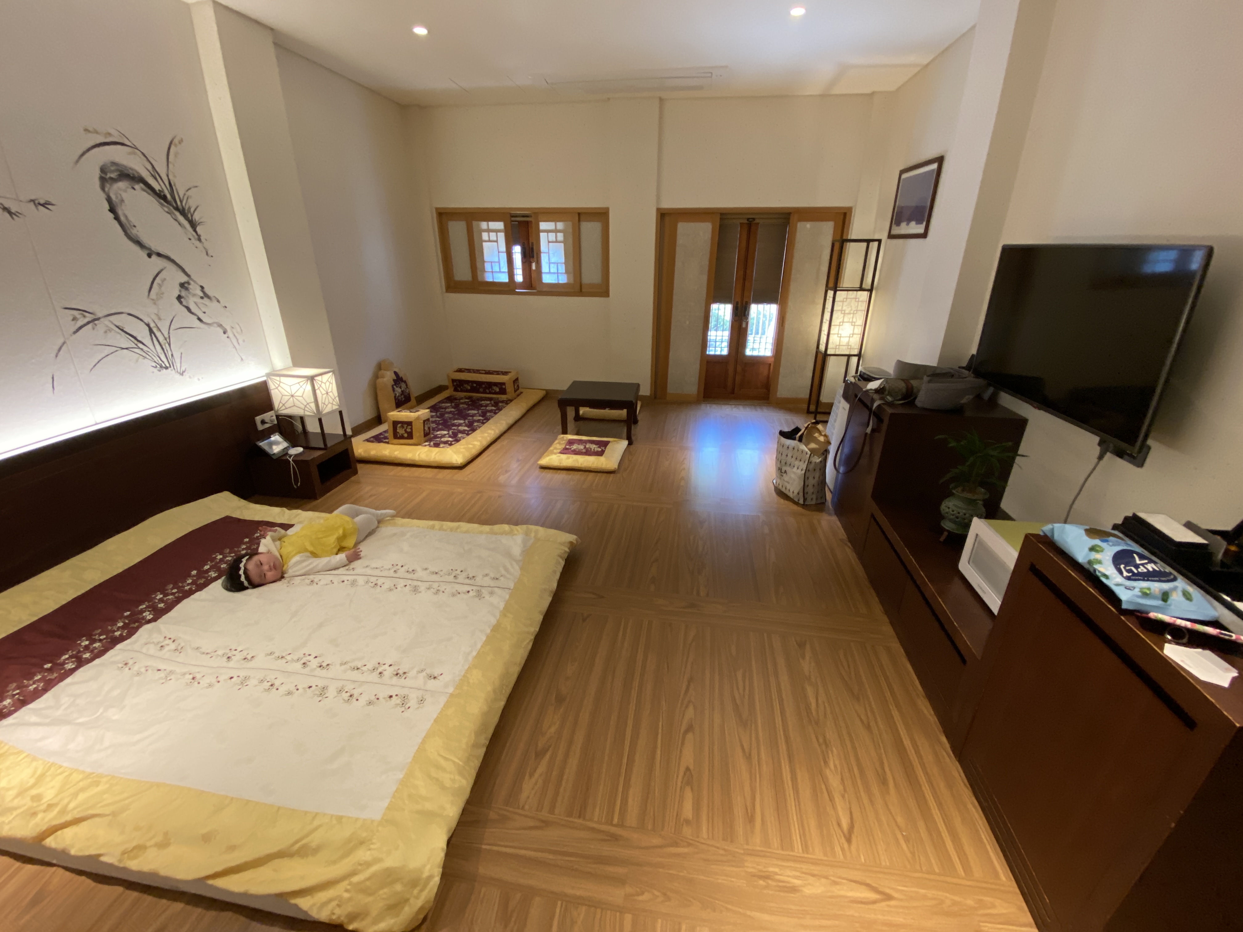 객실은 일반객실과 스위트로 나뉘어지는데, 사진의 온돌방은 일반 객실에만 있습니다. 이번 호캉스의 목적은 하린이의 어린이날 선물이기 때문에 하린이가 맘놓고 기어다닐 수 있는 온돌방으로 선택했습니다. 침구가 맘에 들었는지 아주 편안한 자세로 누워계십니다.