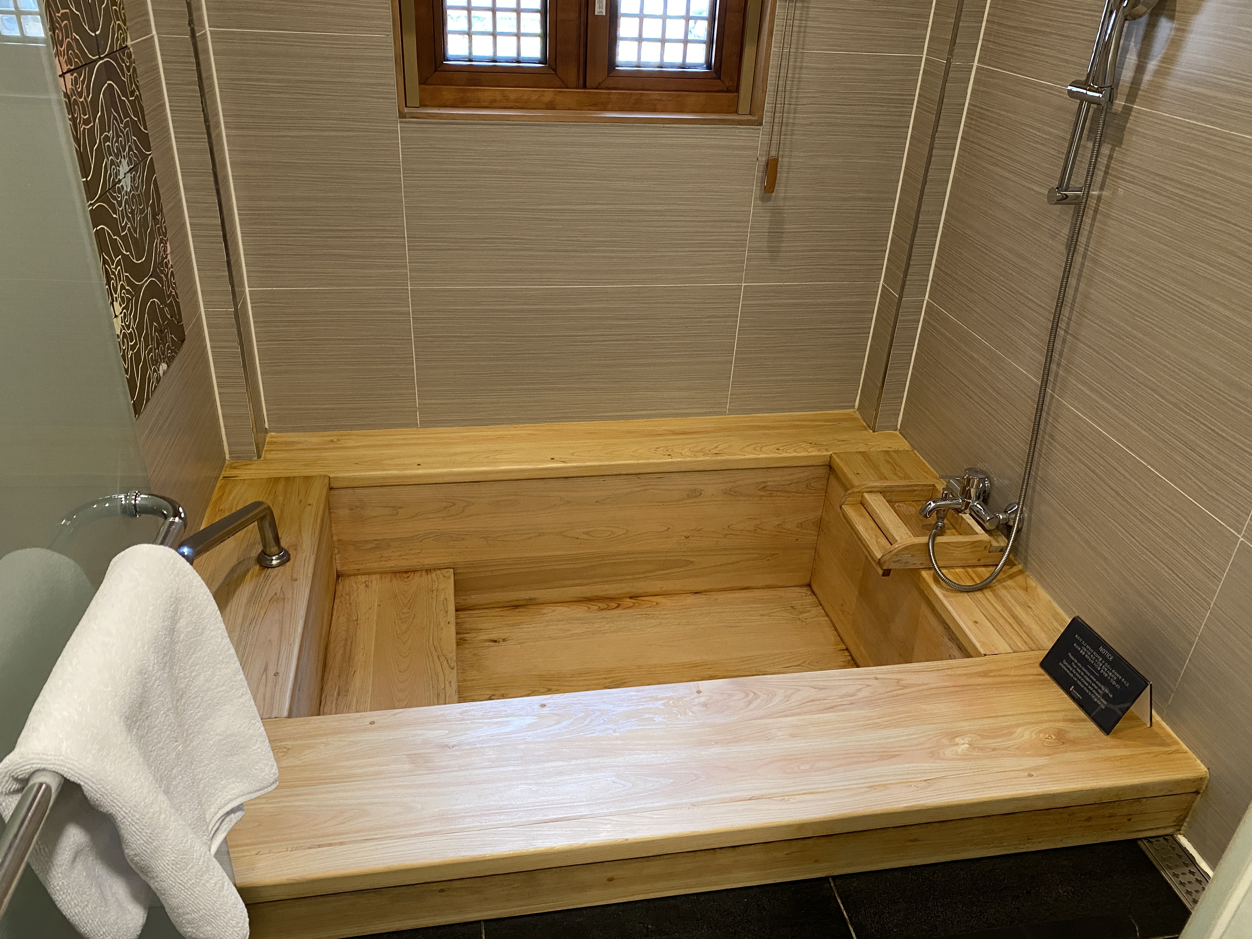 편백나무 욕조가 크게 되어있습니다. 온돌방+큰욕조, 아기 데리고 오기에 최적의 조건입니다. 큰 욕조에서 수영시키기에 딱 좋습니다. 엄마아빠도 목욕을 즐기구요.
