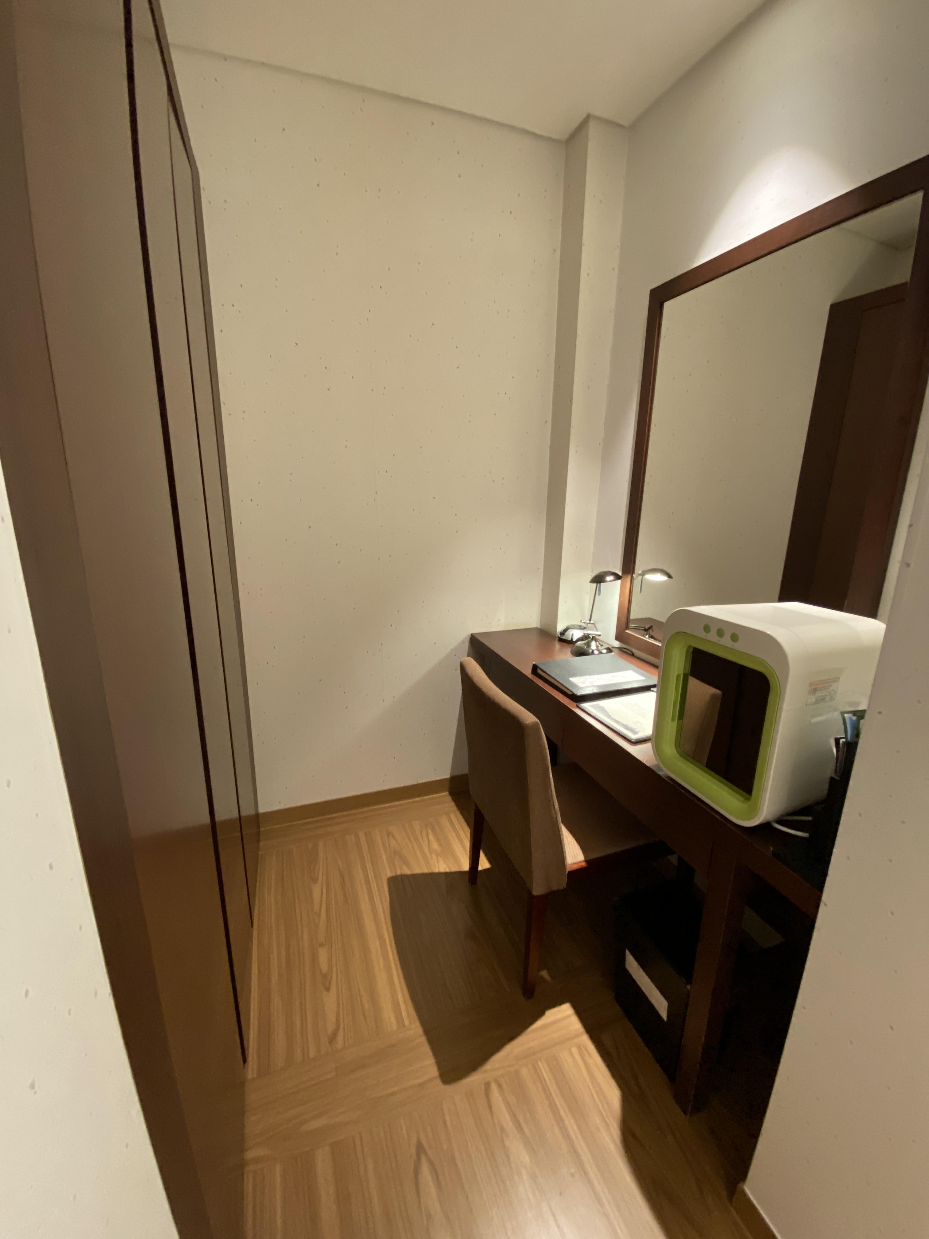 객실 한쪽 구석에는 옷장과 책상이 있는데, 미리 요청했던 유팡 젖병소독기가 세팅되어있습니다. 이 호텔은 신생아를 위한 젖병소독기 및 아기침대를 대여해줍니다. 저희는 온돌방이기때문에 아기침대 대신에 아기 침구를 대여했습니다.