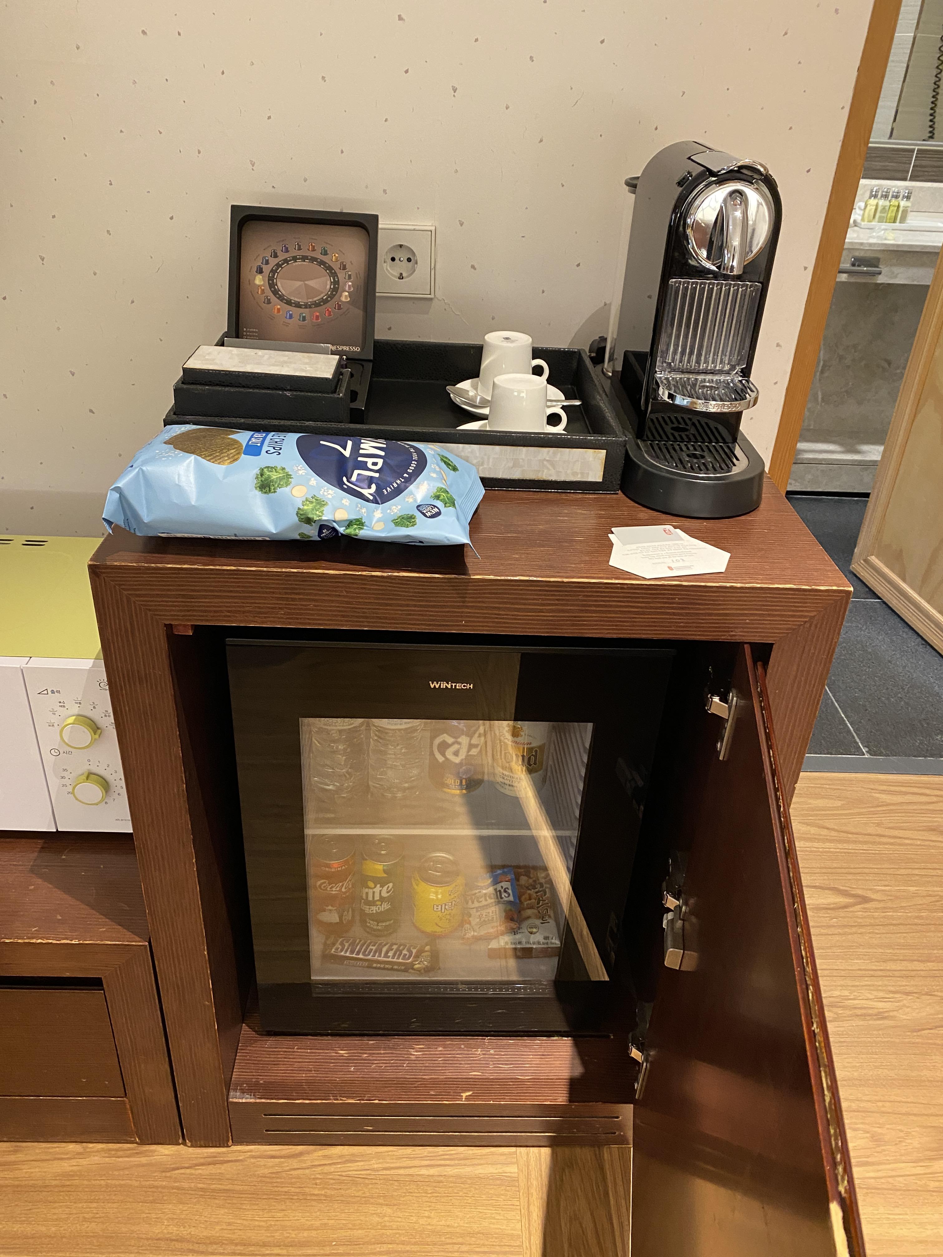 기본적인 어메니티는 갖춰져있고 네스프레소 커피와 맥주 두캔, 음료 세캔, 과자 4종 미니바가 무료로 제공됩니다. 물은 무료입니다.