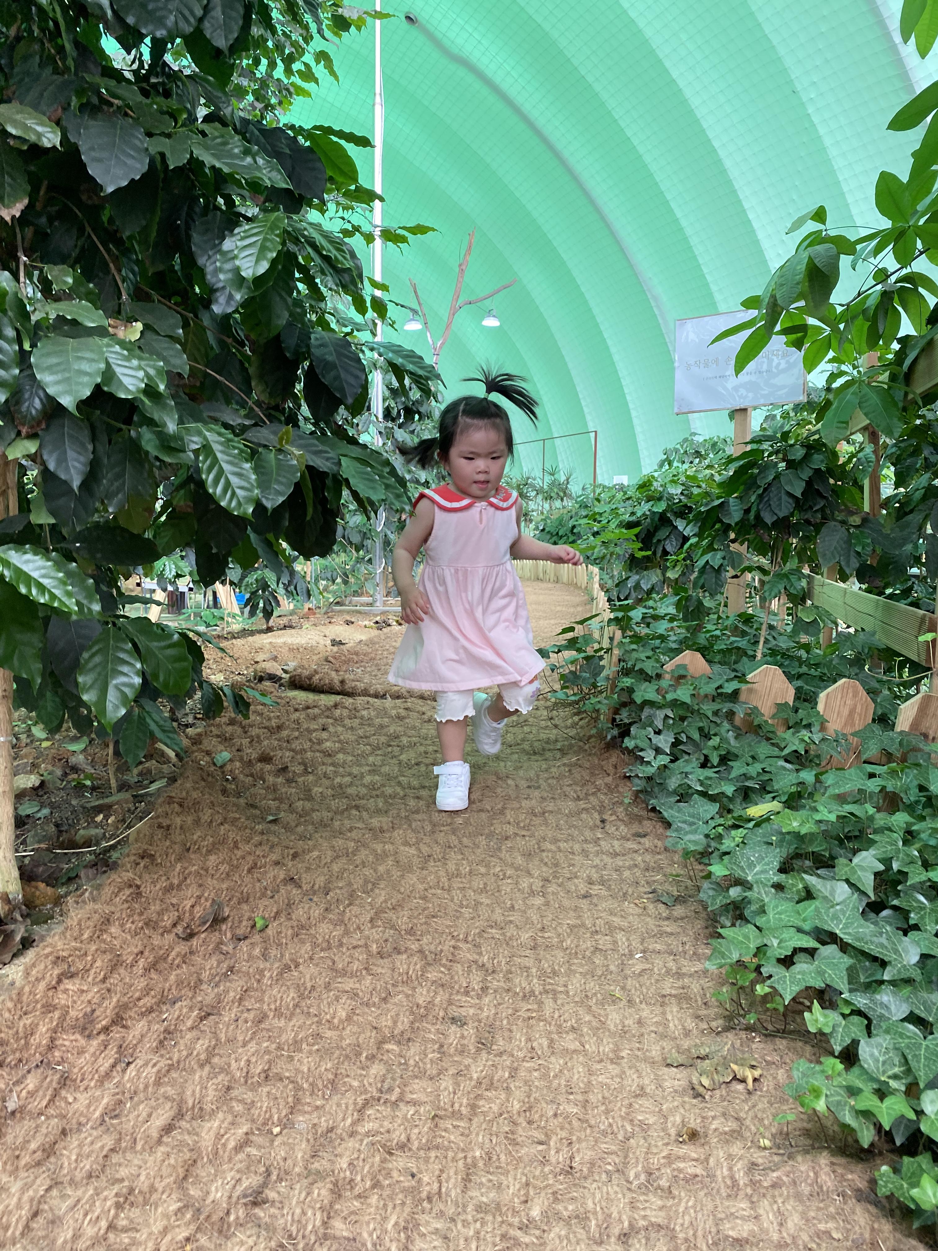 초록색 거대한 온실 안에 커피나무가 가득합니다.