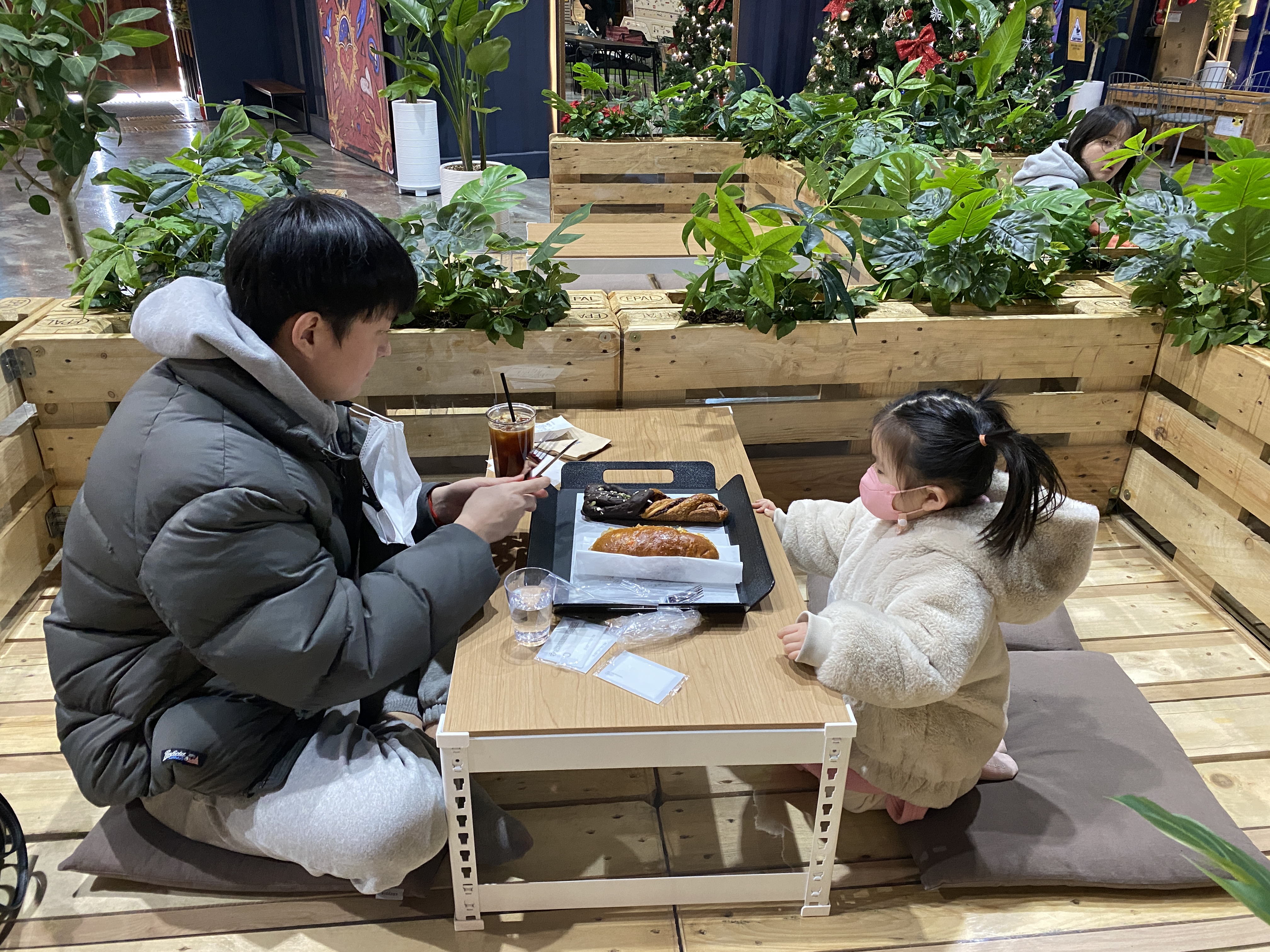 좌식 파레트 테이블에 앉아봅니다.