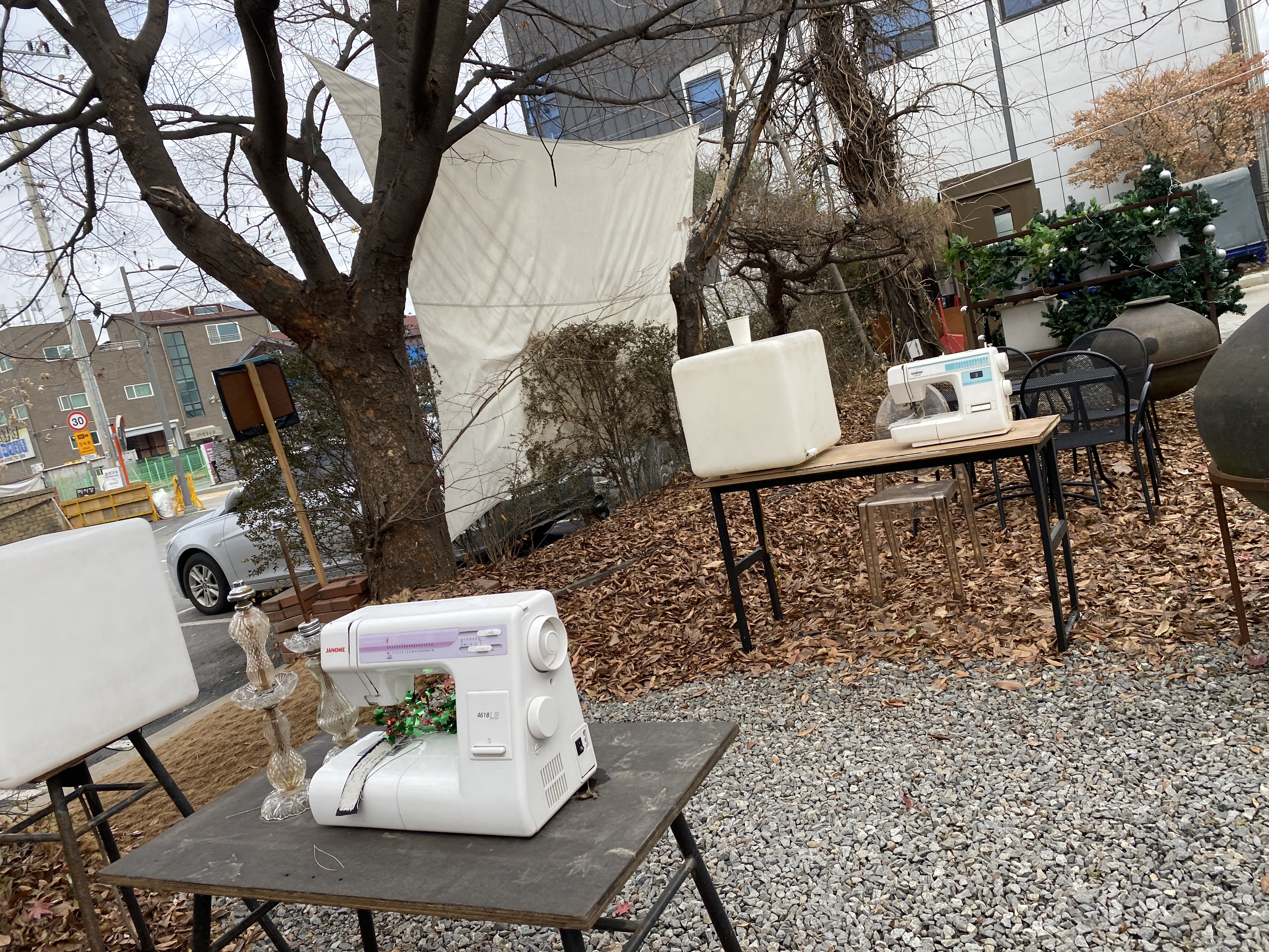 우측의 쌈마이 플라스틱 의자가 대비되는